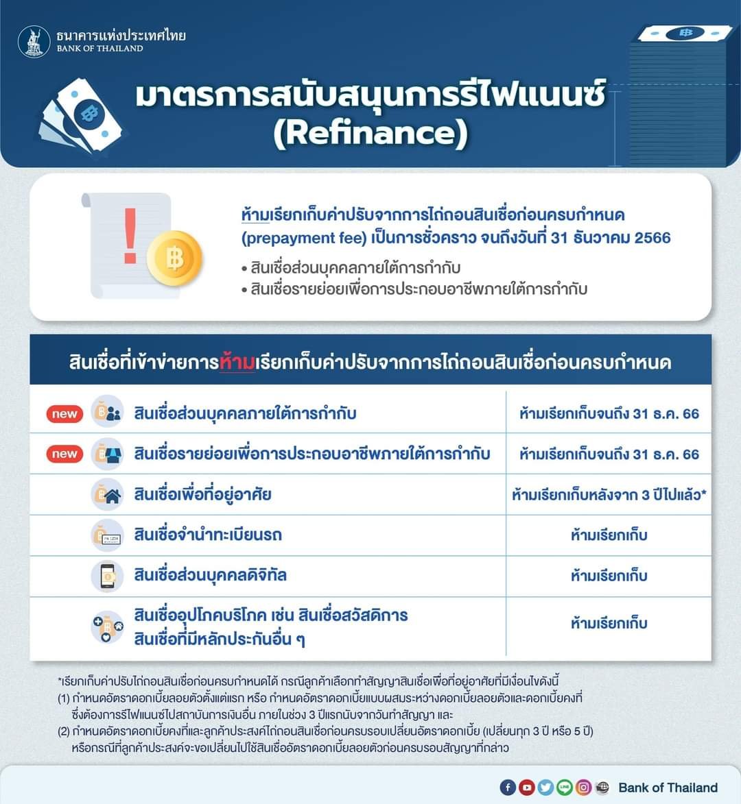 1. ห้ามเรียกเก็บค่าปรับจากการไถ่ถอนสินเชื่อก่อนครบกำหนด (prepayment fee) สำหรับสินเชื่อส่วนบุคคลภายใต้การกำกับ และสินเชื่อรายย่อยเพื่อการประกอบอาชีพภายใต้การกำกับ เป็นการชั่วคราว โดยให้มีผลบังคับใช้ถึงวันที่ 31 ธันวาคม 2566