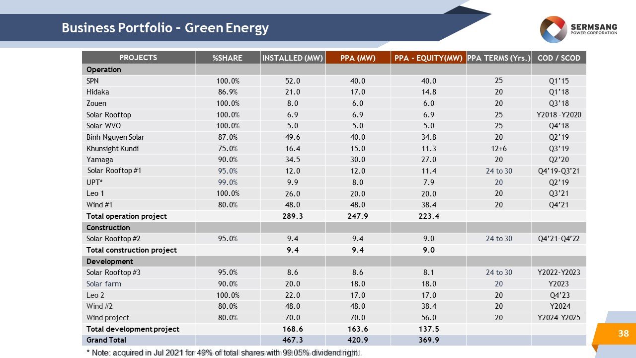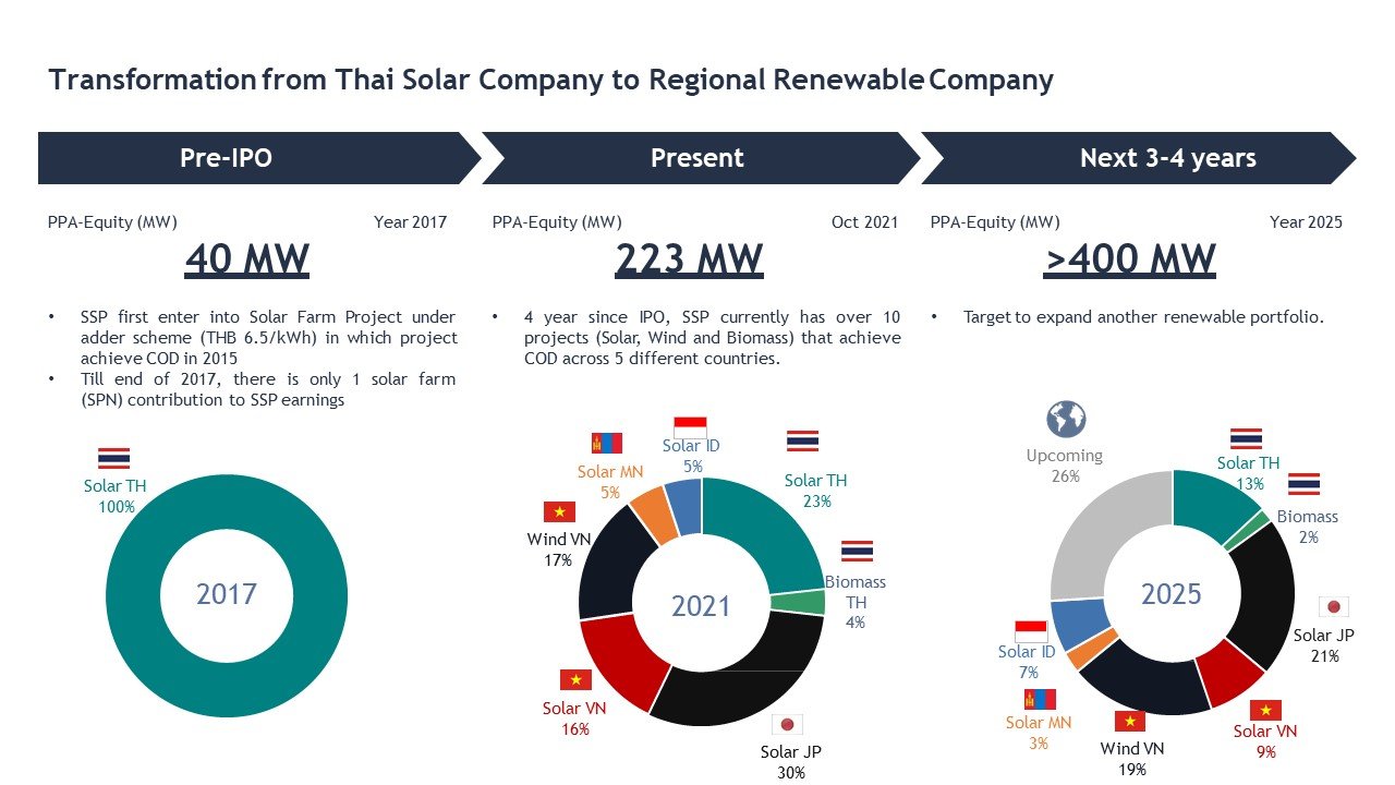 และเพื่อสร้างการเติบโตอย่างยั่งยืน บริษัทฯ พร้อมเดินหน้าขยายการลงทุนโรงไฟฟ้าพลังงานหมุนเวียนทุกประเภท ให้ได้เป้าหมายการมีกำลังการผลิตไฟฟ้าเกิน 400 MW ภายในปี 2567 ผ่านการลงทุนอย่างต่อเนื่อง ไม่ว่าจะเป็นการพัฒนาโครงการโรงไฟฟ้าพลังงานลม เวียดนามในเฟส 2 ขนาดกำลังการผลิต 48 MW เพื่อต่อยอดธุรกิจด้านพลังงานลม หรือการขยายการลงทุนโรงไฟฟ้าพลังงานแสงอาทิตย์บนหลังคา (Solar Rooftop) ในอินโดนีเซีย และญี่ปุ่น ซึ่งมีกำลังการผลิตแห่งละ 17 MW ซึ่งปัจจุบันอยู่ระหว่างขั้นตอนทำการศึกษาและเตรียมพัฒนาโครงการ ในช่วง 2 ปีนี้