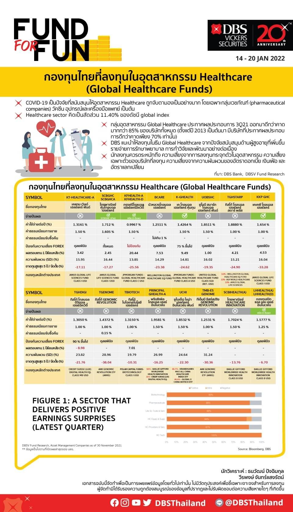 ฝ่ายวิจัย บล.ดีบีเอส วิคเกอร์ส ไทย (DBSV) แนะนำให้ลงทุนธีม Global Healthcare เพราะเป็นธุรกิจที่มีศักยภาพการเติบโตอย่างมีนัยยะสำคัญ จากการที่ทั่วโลกกำลังเข้าสู่สังคมผู้สูงอายุ ซึ่งการเจ็บป่วยในผู้สูงอายุส่วนใหญ่จะเป็นโรคเรื้อรังที่ต้องพบแพทย์อย่างต่อเนื่อง ขณะเดียวกัน ไลฟ์สไตล์ชีวิตในเมืองใหญ่ก็เป็นสาเหตุของโรคอ้วน โรคภูมิแพ้ และโรคแทรกซ้อนต่างๆ ทำให้จำนวนผู้ป่วยเพิ่มมากขึ้นเรื่อยๆ ส่งผลให้ค่าใช้จ่ายในการรักษาพยาบาลเติบโตขึ้น และผลักดันให้ธุรกิจที่เกี่ยวข้อง ไม่ว่าจะเป็น อุปกรณ์และเครื่องมือแพทย์ เวชภัณฑ์ หรือบริการที่เกี่ยวเนื่องกับระบบประกันสุขภาพ ขยายตัวตามไปด้วย