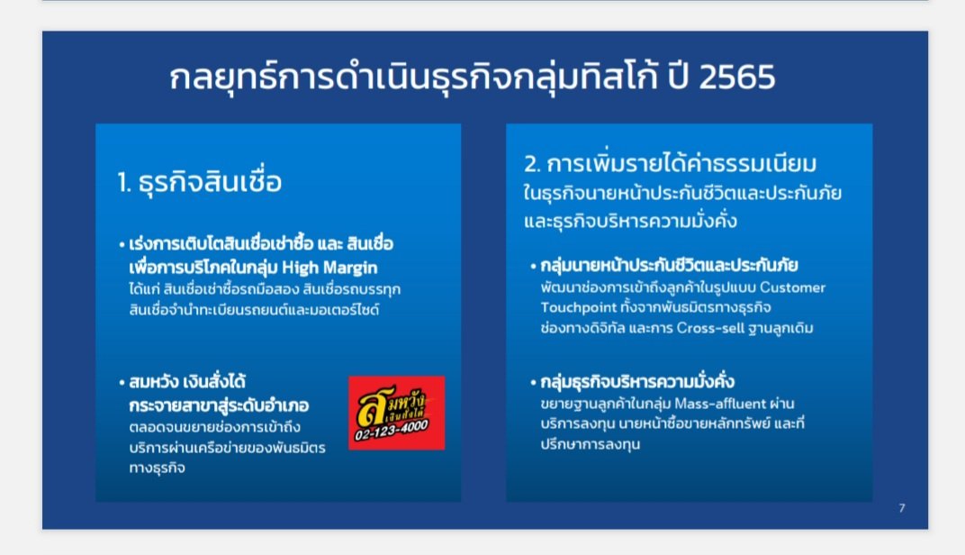 ด้านเคจีไอ (KGI) ชี้ประเด็นว่า เริ่มเห็นการเติบโตของสินเชื่ออีกครั้งในไตรมาส 4 โดยเฉพาะสินเชื่อจำนำทะเบียน ที่เติบโตจากไตรมาส 3 ราว 2% ยิ่งผู้บริหารคาดว่า จะเห็นการเติบโตของสินเชื่อได้ในปีนี้ โดยวางเป้าหมายการเติบโตของสินเชื่อรวมที่ 3-5% จากที่ติดลบมาตลอด 3 ปีที่ผ่านมา ซึ่งหากสินเชื่อกลับมาขยายตัวได้จริง จะถือเป็นจุดเปลี่ยนสำคั ญอีกครั้ง แต่ในเบื้องต้น ยังให้น้ำหนักกับ TISCO ในฐานะหุ้นปันผล ราคาเป้าหมาย 108 บาท (P/E 10.5 เท่า)