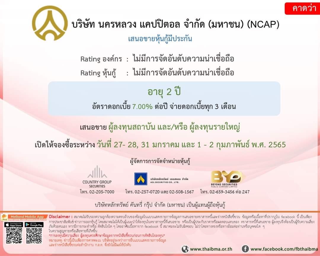 ขณะที่ บมจ.นครหลวง แคปปิตอล (NCAP) เสนอขายหุ้นกู้มีประกัน อายุ 2 ปี อัตราดอกเบี้ยปีละ 7.00% จ่ายดอกเบี้ยทุก 3 เดือน วงเงินรวมไม่เกิน 250 ล้านบาท เปิดให้จองซื้อ ระหว่างวันที่ 27 – 28 มกราคม และ 31 มกราคม – 2 กุมภาพันธ์นี้ โดยมี บมจ.หลักทรัพย์ คันทรี่ กรุ๊ป, บมจ.หลักทรัพย์ บียอนด์ และ บริษัทหลักทรัพย์ เอเอสแอแล เป็นผู้จัดการการจัดจำหน่ายหุ้นกู้ ทั้งนี้ บมจ.หลักทรัพย์ คันทรี่ กรุ๊ป จะรับหน้าที่เป็นผู้แทนผู้ถือหุ้นกู้ด้วย