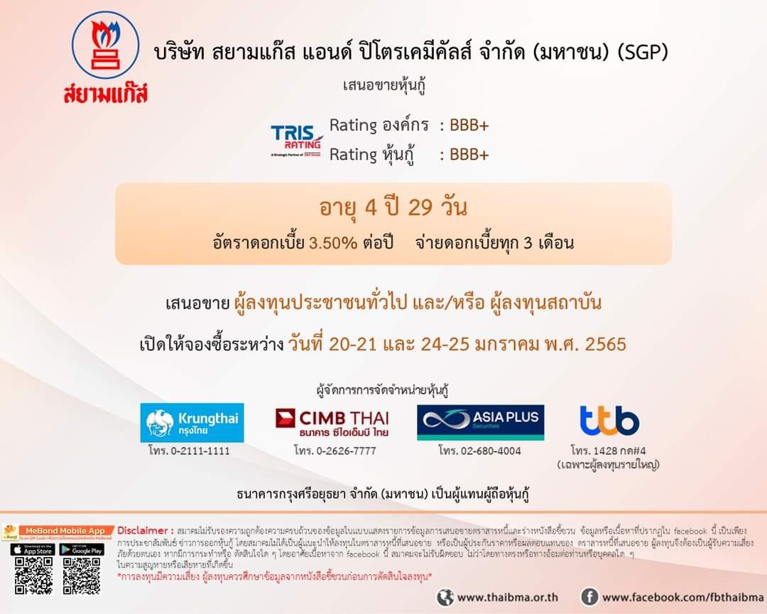 บมจ.สยามแก๊ส แอนด์ ปิโตรเคมีคัลส์ (SGP) เสนอขายหุ้นกู้อายุ 4 ปี 29 วัน อัตราดอกเบี้ยปีละ 3.50% จ่ายดอกเบี้ยทุก 3 เดือน วงเงินรวมไม่เกิน 4,000 ล้านบาท เปิดให้จองซื้อ ระหว่างวันที่ 20 – 21 มกราคม และวันที่ 24 – 25 มกราคมนี้ โดยมี ธนาคารกรุงไทย, ธนาคารซีไอเอ็มบี ไทย, บริษัทหลักทรัพย์ เอเซีย พลัส และธนาคารทหารไทยธนชาต เป็นผู้จัดการการจัดจำหน่ายหุ้นกู้ และธนาคารกรุงศรีอยุธยา เป็นผู้แทนผู้ถือหุ้นกู้