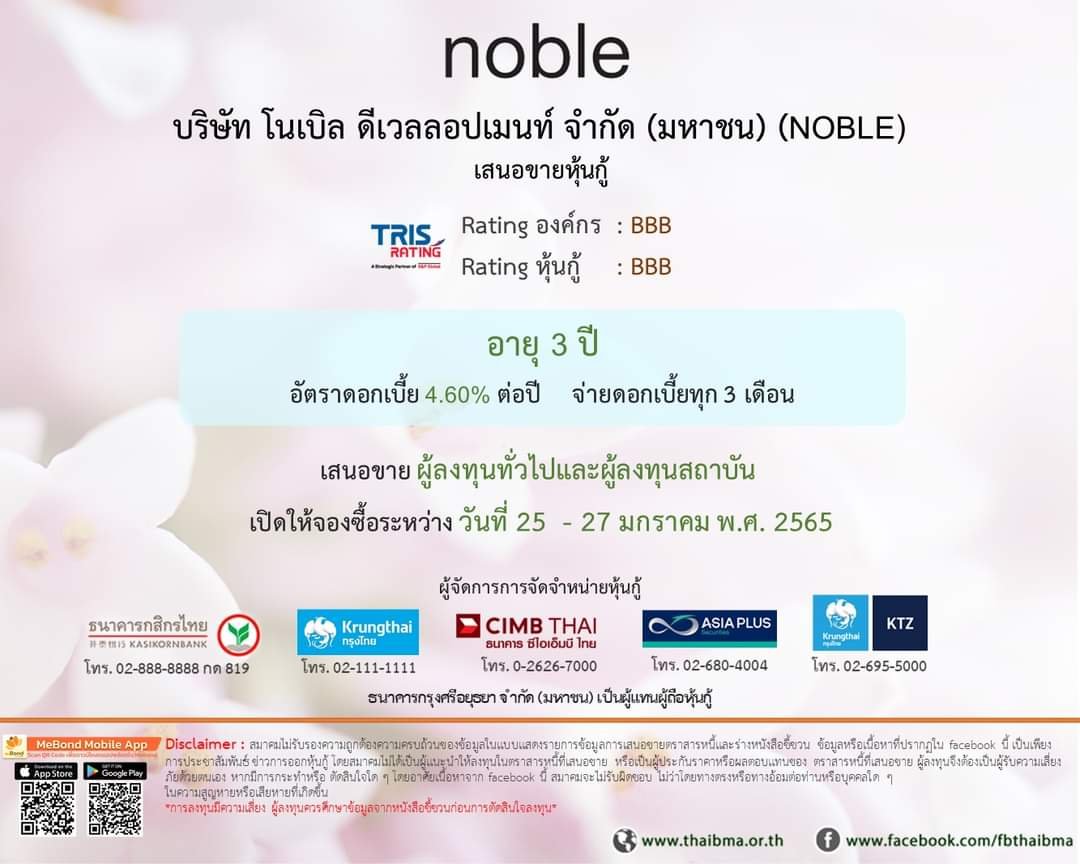 ส่วน บมจ. โนเบิล ดีเวลลอปเมนท์ (NOBLE) เสนอขายหุ้นกู้ไม่ด้อยสิทธิ ไม่มีหลักประกัน อายุ 3 ปี ดอกเบี้ยปีละ 4.60% จ่ายดอกเบี้ยทุก 3 เดือน วงเงินรวมไม่เกิน 1,800 ล้านบาทเปิดให้จองซื้อ ระหว่างวันที่ 25 – 27 มกราคมนี้ โดยมีธนาคารกสิกรไทย, ธนาคารกรุงไทย, ธนาคารซีไอเอ็มบี ไทย, บริษัทหลักทรัพย์ เอเซีย พลัส, บริษัท หลักทรัพย์ กรุงไทย ซีมิโก้ เป็นผู้จัดการการจัดจำหน่ายหุ้นกู้ และธนาคารกรุงศรีอยุธยา เป็นผู้แทนผู้ถือหุ้นกู้