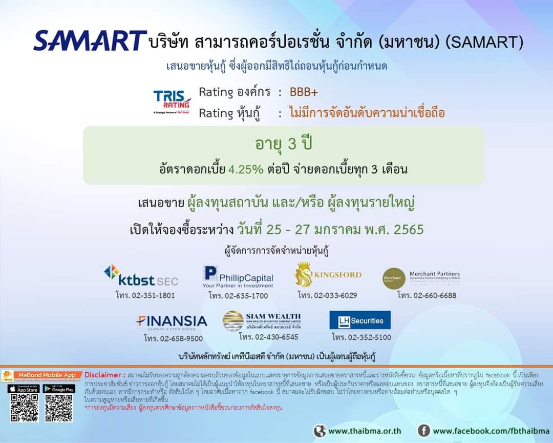 บมจ.สามารถคอร์ปอเรชั่น (SAMART) เสนอขายหุ้นกู้ซึ่งผู้ออกมีสิทธิไถ่ถอนก่อนกำหนด อายุ 3 ปี ดอกเบี้ยปีละ 4.25% จ่ายดอกเบี้ยทุก 3 เดือน วงเงินรวมไม่เกิน 1,700 ล้านบาทเปิดให้จองซื้อ ระหว่างวันที่ 25 – 27 มกราคมนี้ โดยมี บมจ.หลักทรัพย์ เคทีบี ประเทศไทย, บมจ.หลักทรัพย์ ฟิลลิป ประเทศไทย, บมจ.หลักทรัพย์ คิงส์ฟอร์ด, บริษัท หลักทรัพย์ สยามเวลธ์, บมจ.หลักทรัพย์ ฟินันเซีย ไซรัส, บริษัทหลักทรัพย์ เมอร์ชั่น พาร์ทเนอร์, และบริษัทหลักทรัพย์ แลนด์ แอนด์ เฮ้าส์ เป็นผู้จัดการการจัดจำหน่ายหุ้นกู้ ทั้งนี้ บมจ.หลักทรัพย์ เคทีบี ประเทศไทย จะรับหน้าที่เป็นผู้แทนผู้ถือหุ้นกู้ด้วย