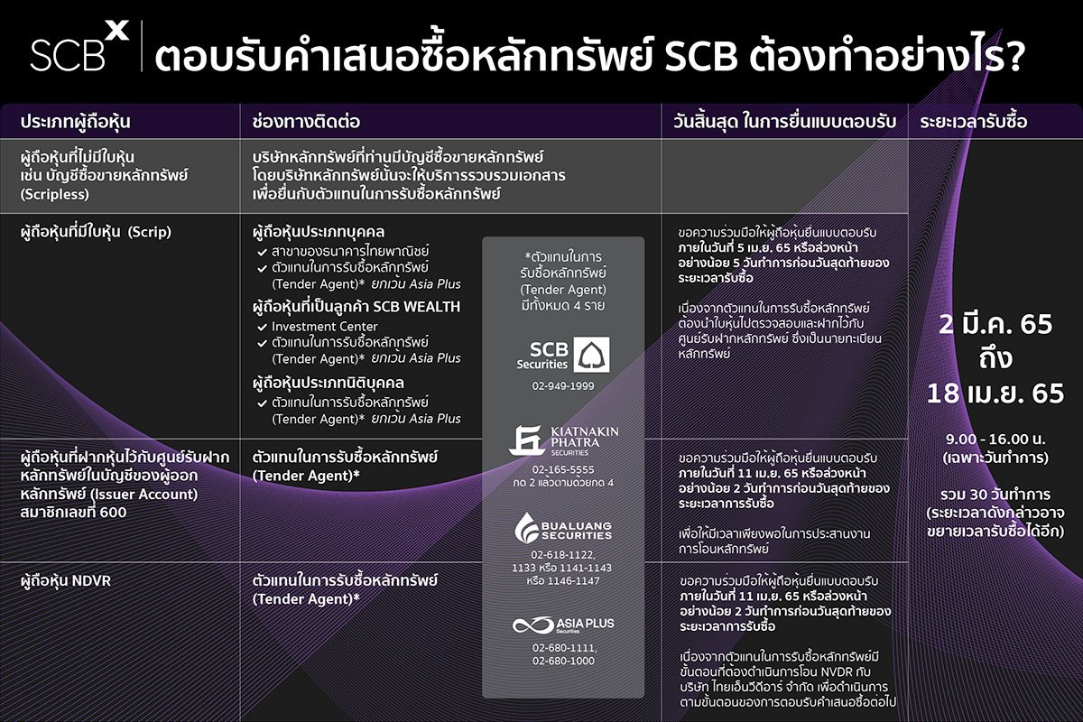 อย่างไรก็ตาม การแลกหุ้นครั้งนี้จะไม่ได้เป็นไปโดยอัตโนมัติ แต่จะเกิดเฉพาะกรณีที่ผู้ถือหุ้น SCB ทำการ "ตอบรับ" คำเสนอซื้อหลักทรัพย์แล้วเท่านั้น โดยจะเริ่มกระบวนการแลกหุ้นตั้งแต่วันที่ 2 มีนาคม ไปจนถึงวันที่ 18 เมษายนที่จะถึงนี้ และเมื่อกระบวนการแลกหุ้นแล้วเสร็จลงไป จะต้องมีจำนวนผู้ถือหุ้น SCB ที่ตอบรับคำเสนอซื้อไม่น้อยกว่า 90% ของจำนวนสิทธิออกเสียงทั้งหมดของ SCB ถึงจะมีผลให้หุ้น SCBX สามารถเข้าจดทะเบียนในตลาดหลักทรัพย์ฯ ได้ โดยผู้ถือหุ้น SCB ที่ได้ทำการแลกหุ้นเสร็จสมบูรณ์ตามกำหนดเวลา จะเปลี่ยนเป็นผู้ถือหุ้น SCBX แทน แต่จะยังคงใช้ชื่อย่อหลักทรัพย์ "SCB" เช่นเดิม