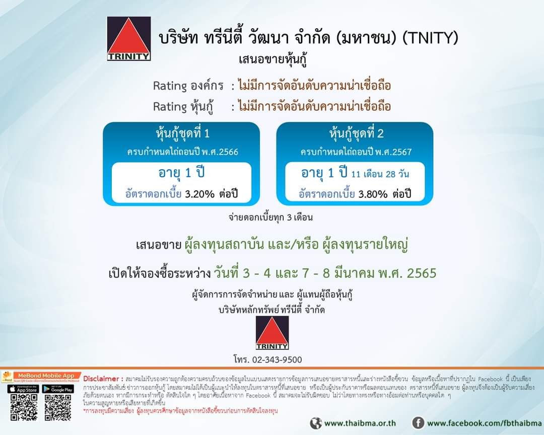 ด้าน บมจ.ทรีนีตี้ วัฒนา (TNITY) เสนอขายหุ้นกู้ไม่ด้อยสิทธิ ไม่มีประกัน 2 ชุด แต่จำกัดวงเฉพาะนักลงทุนสถาบัน และนักลงทุนรายใหญ่ วงเงินรวมไม่เกิน 400 ล้านบาท จ่ายดอกเบี้ยทุก 3 เดือน ดังนี้
