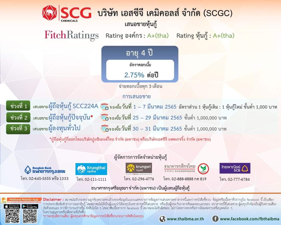 ช่วงที่ 1 เสนอขายผู้ถือหุ้นกู้ SCC224A ตั้งแต่วันที่ 1 - 7 มีนาคม ในสัดส่วน 1 หุ้นกู้เดิม ต่อ 1 หุ้นกู้ใหม่ จองซื้อขั้นต่ำ 1,000 บาท ทวีคูณครั้งละ 1,000 บาท)