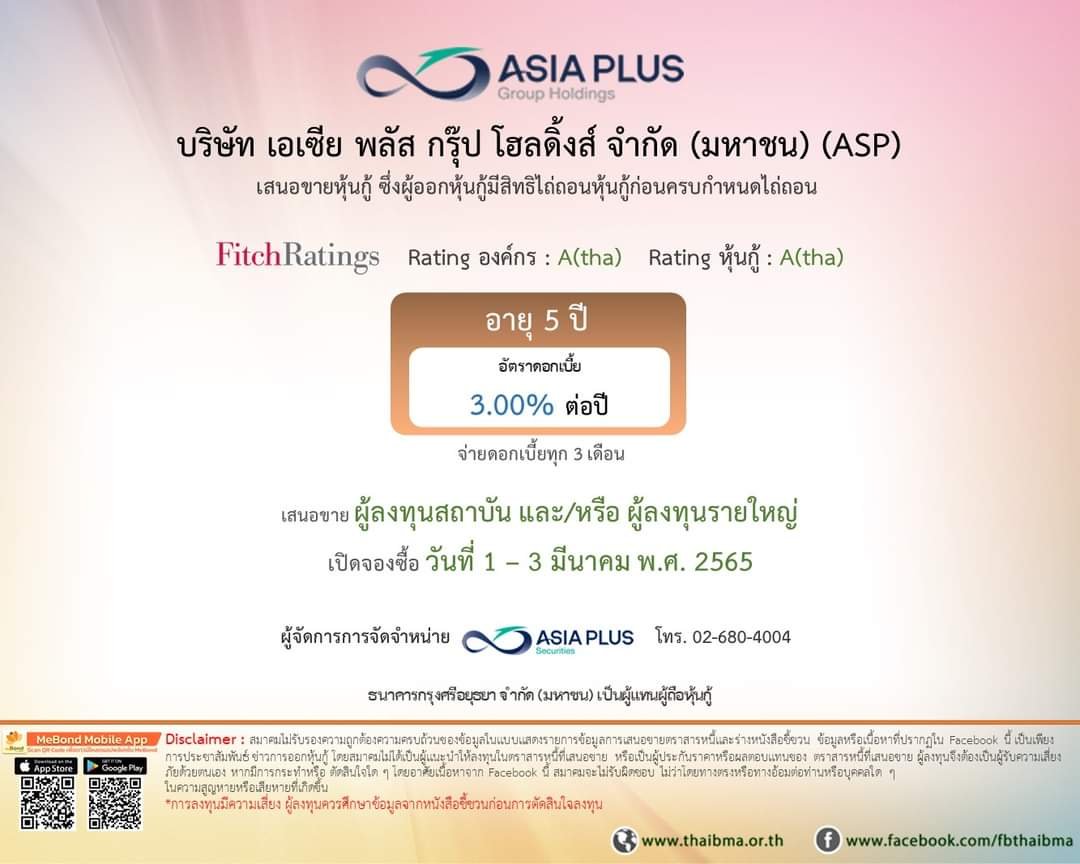 บมจ.เอเซีย พลัส กรุ๊ป โฮลดิ้งส์ (ASP) เสนอขายหุ้นกู้ไม่ด้อยสิทธิ ไม่มีประกัน และผู้ออกหุ้นกู้มีสิทธิไถ่ถอนก่อนกำหนด อายุ 5 ปี อัตราดอกเบี้ยปีละ 3.00% จ่ายดอกเบี้ยทุก 3 เดือน วงเงินรวมไม่เกิน 1,000 ล้านบาท สำหรับนักลงทุนสถาบัน และนักลงทุนรายใหญ่ เท่านั้น ตั้งแต่วันที่ 1 – 3 มีนาคมนี้ โดยมี บล. เอเซีย พลัส เป็นผู้จัดการการจัดจำหน่ายหุ้นกู้ และธนาคารกรุงศรีอยุธยา เป็นผู้แทนผู้ถือหุ้นกู้