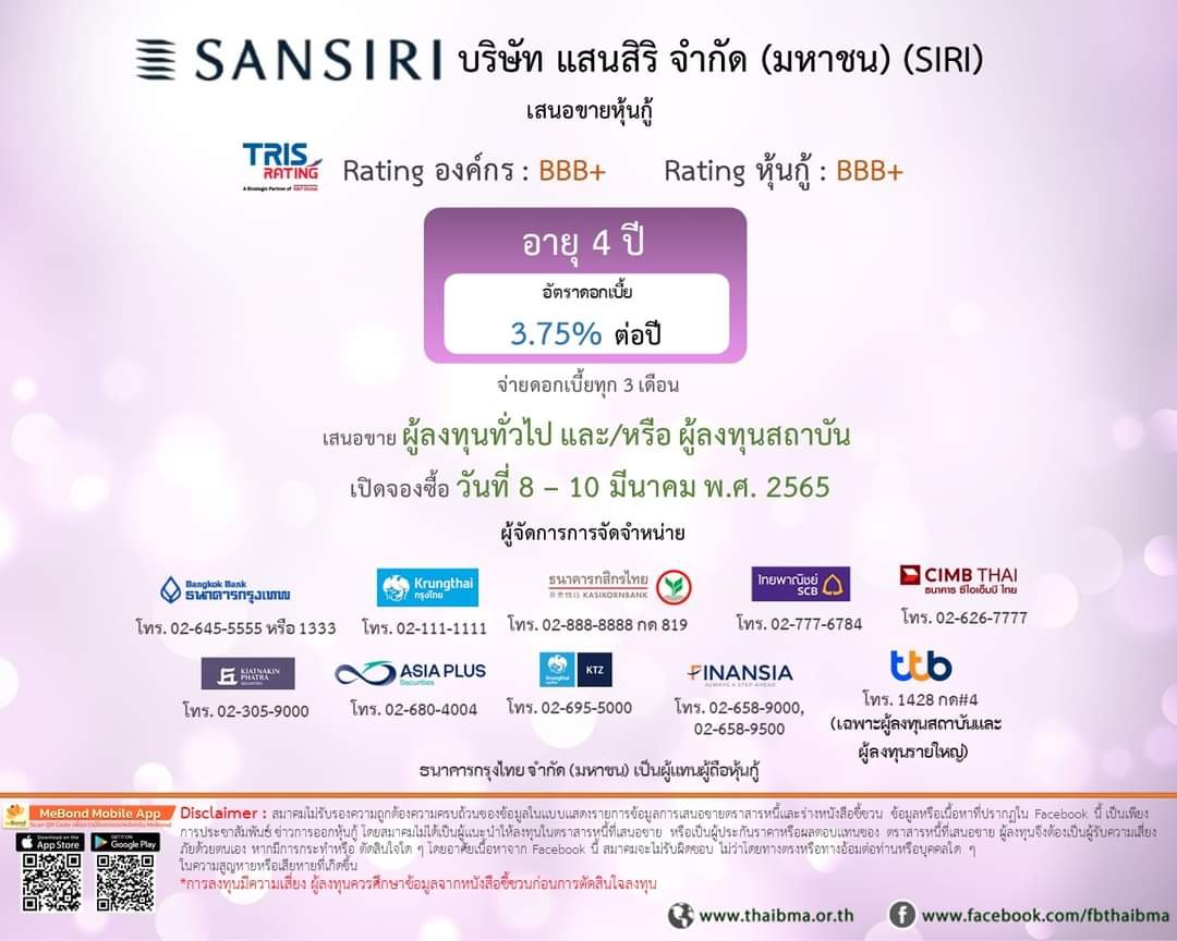 ส่วน บมจ.แสนสิริ (SIRI) เสนอขายหุ้นกู้ไม่ด้อยสิทธิ ไม่มีประกัน อายุ 4 ปี อัตราดอกเบี้ยปีละ 3.75% จ่ายดอกเบี้ยทุก 3 เดือน วงเงินรวมไม่เกิน 5,000 ล้านบาท เปิดให้จองซื้อวันที่ 8 – 10 มีนาคมนี้ โดยมีธนาคารกรุงเทพ, ธนาคารกรุงไทย, ธนาคารกสิกรไทย, ธนาคารไทยพาณิชย์, ธนาคารซีไอเอ็มบี (ไทย), ธนาคารทหารไทยธนชาต, บมจ.หลักทรัพย์เกียรตินาคิน ภัทร, บล.กรุงไทย ซีมิโก้, บล.เอเซีย พลัส และ บมจ.หลักทรัพย์ ฟินันเซีย ไซรัส เป็นผู้จัดการการจัดจำหน่ายหุ้นกู้ ซึ่งธนาคารกรุงไทย จะรับหน้าที่ผู้แทนผู้ถือหุ้นกู้เพิ่มด้วย