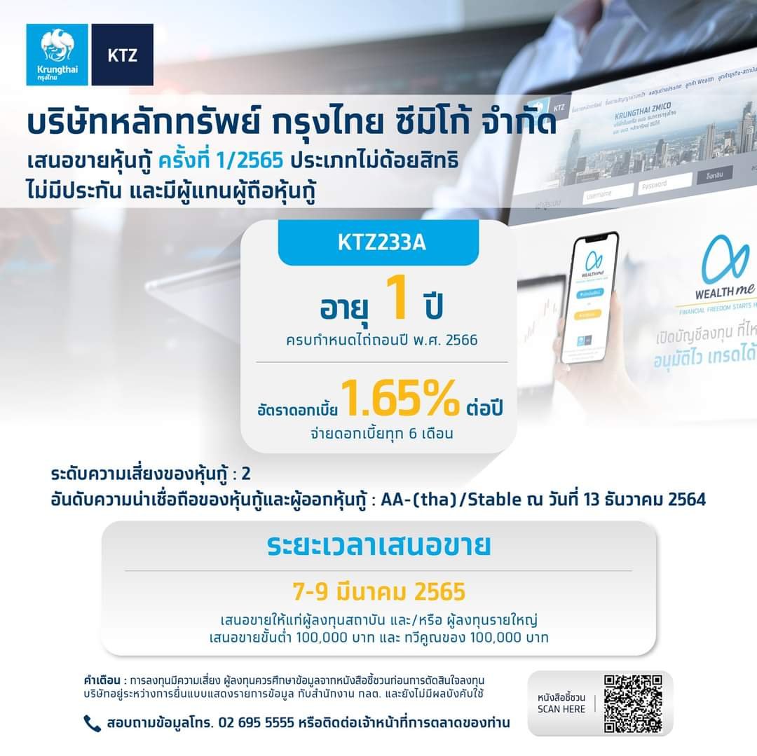 ขณะที่บริษัทหลักทรัพย์ กรุงไทย ซีมิโก้ (KTZ) เสนอขายหุ้นกู้ไม่ด้อยสิทธิ ไม่มีประกัน อายุ 1 ปี อัตราดอกเบี้ยปีละ 1.65% จ่ายดอกเบี้ยทุก 6 เดือน วงเงินรวมไม่เกิน 700 ล้านบาท เฉพาะนักลงทุนสถาบัน และนักลงทุนรายใหญ่ ระหว่างวันที่ 7– 9 มีนาคมนี้ ผ่านบริษัทฯ เอง โดยมีธนาคารกรุงศรีอยุธยา เป็นผู้แทนผู้ถือหุ้นกู้
