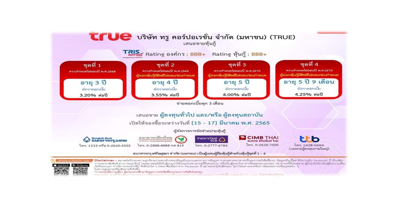 ส่วน บมจ.ทรู คอร์ปอเรชั่น (TRUE) เสนอขายหุ้นกู้ไม่ด้อยสิทธิ ไม่มีประกัน 4 ชุด วงเงินรวมไม่เกิน 1.8 แสนล้านบาท จ่ายดอกเบี้ยทุก 3 เดือน ดังนี้