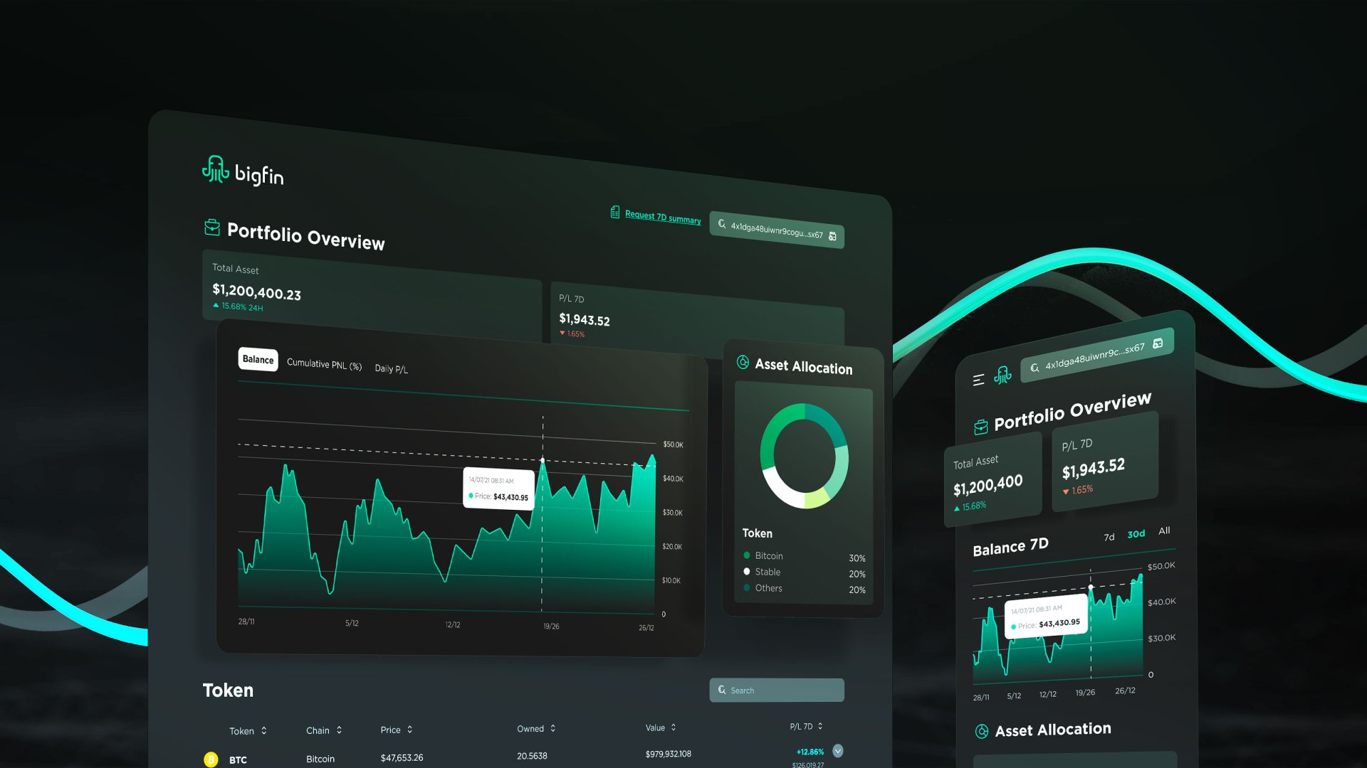 และเนื่องจากเครื่องมือที่มีในตลาดยังไม่สามารถให้ข้อมูลสำคัญ และมีความหมายแก่นักลงทุนได้ ไม่ว่าจะเป็นการแสดงต้นทุนการลงทุนของตนเอง การแจ้งเตือนเมื่อมูลค่าสินทรัพย์ในพอร์ตมีการเปลี่ยนแปลง หรือการดูข้อมูลกำไร-ขาดทุนของพอร์ตรวม และดูแยกเป็นรายสินทรัพย์ ดังนั้น บริษัท กสิกร เอกซ์ จำกัด (KX) บริษัทในเครือ บมจ. ธนาคารกสิกรไทย (KBANK) และ KBTG ที่ดำเนินธุรกิจด้านนวัตกรรมในโลก Decentralized Finance (DeFi) และสินทรัพย์ดิจิทัล จึงได้พัฒนา Bigfin เครื่องมือวิเคราะห์และดูแลพอร์ตการลงทุนในคริปโทเคอร์เรนซี และสินทรัพย์ดิจิทัล พร้อมแจ้งเตือนเมื่อมูลค่าพอร์ตมีการเปลี่ยนแปลงอย่างมีนัยสำคัญ