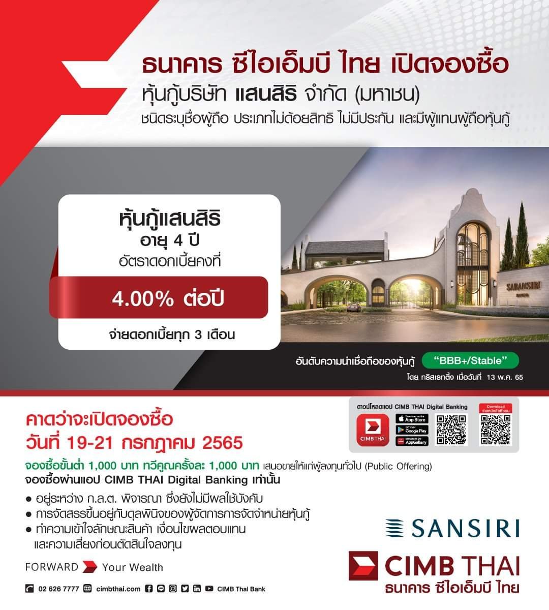 อนึ่ง หุ้นกู้แสนสิริ ทั้ง 2 รุ่น ได้รับการจัดอันดับความน่าเชื่อถือ จากทริส เรทติ้ง ที่ระดับ BBB+ แนวโน้มอันดับเครดิต Stable