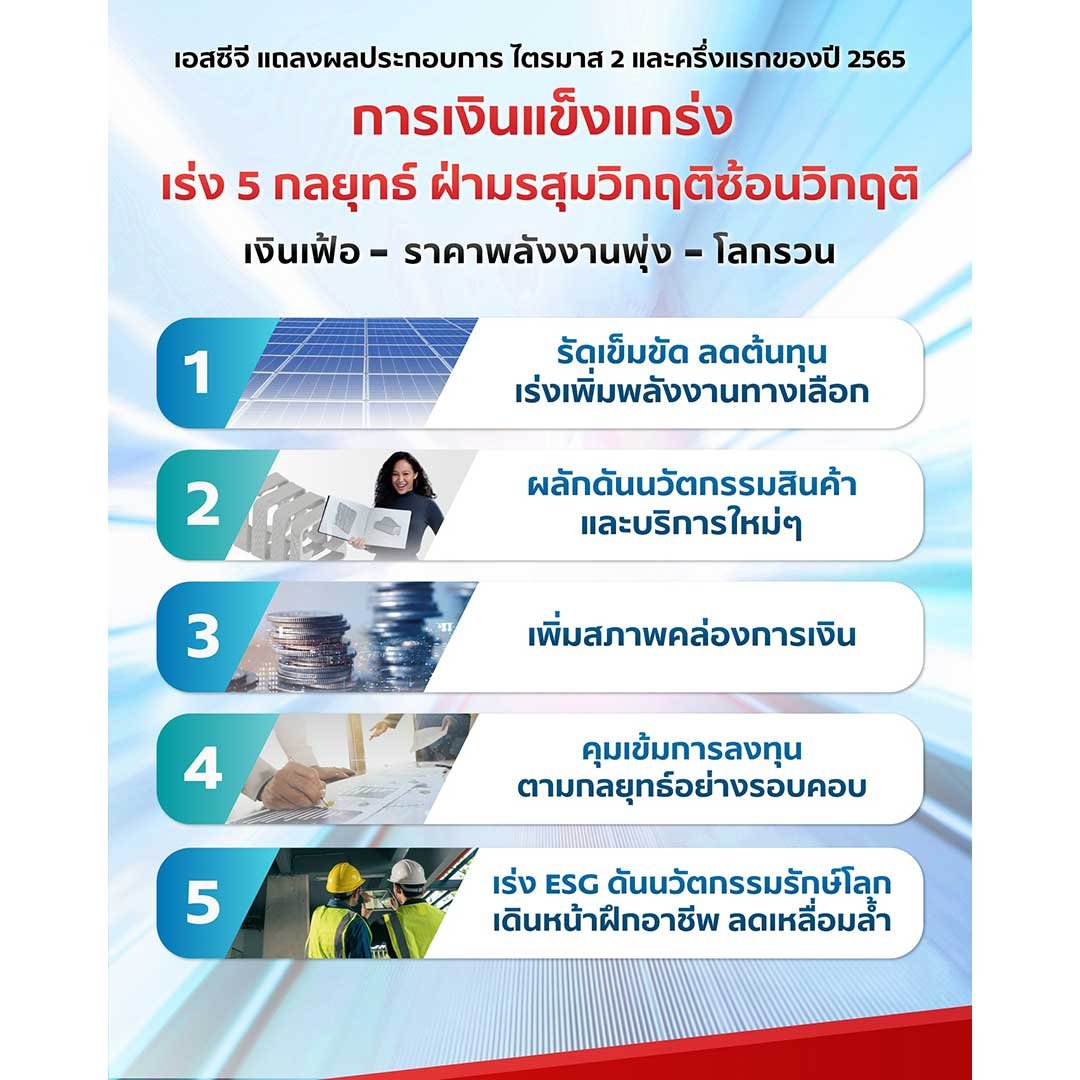 ประธานเจ้าหน้าที่บริหาร SCC ยังเปิดเผยกลยุทธ์การทำธุรกิจในครึ่งปีหลังด้วยว่า เพื่อบริหารความเสี่ยงจากเศรษฐกิจโลกที่ยังมีความไม่แน่นอนสูง บริษัทฯ พร้อมเร่งดำเนินการ 5 กลยุทธ์ ประกอบด้วย ลดต้นทุน เพิ่มพลังงานทางเลือก พร้อมกับพัฒนานวัตกรรมสินค้าและบริการที่มีมูลค่าเพิ่มใหม่ๆ ต่อเนื่อง ขณะเดียวกันก็จะหาวิธีการเพิ่มสภาพคล่องการเงิน และระมัดระวังการลงทุนมากขึ้น โดยไม่ลืมเดินหน้าเป้าหมาย ESG ด้วยแนวทาง ESG 4 Plus ที่ประกาศไว้ตั้งแต่ต้นปี
