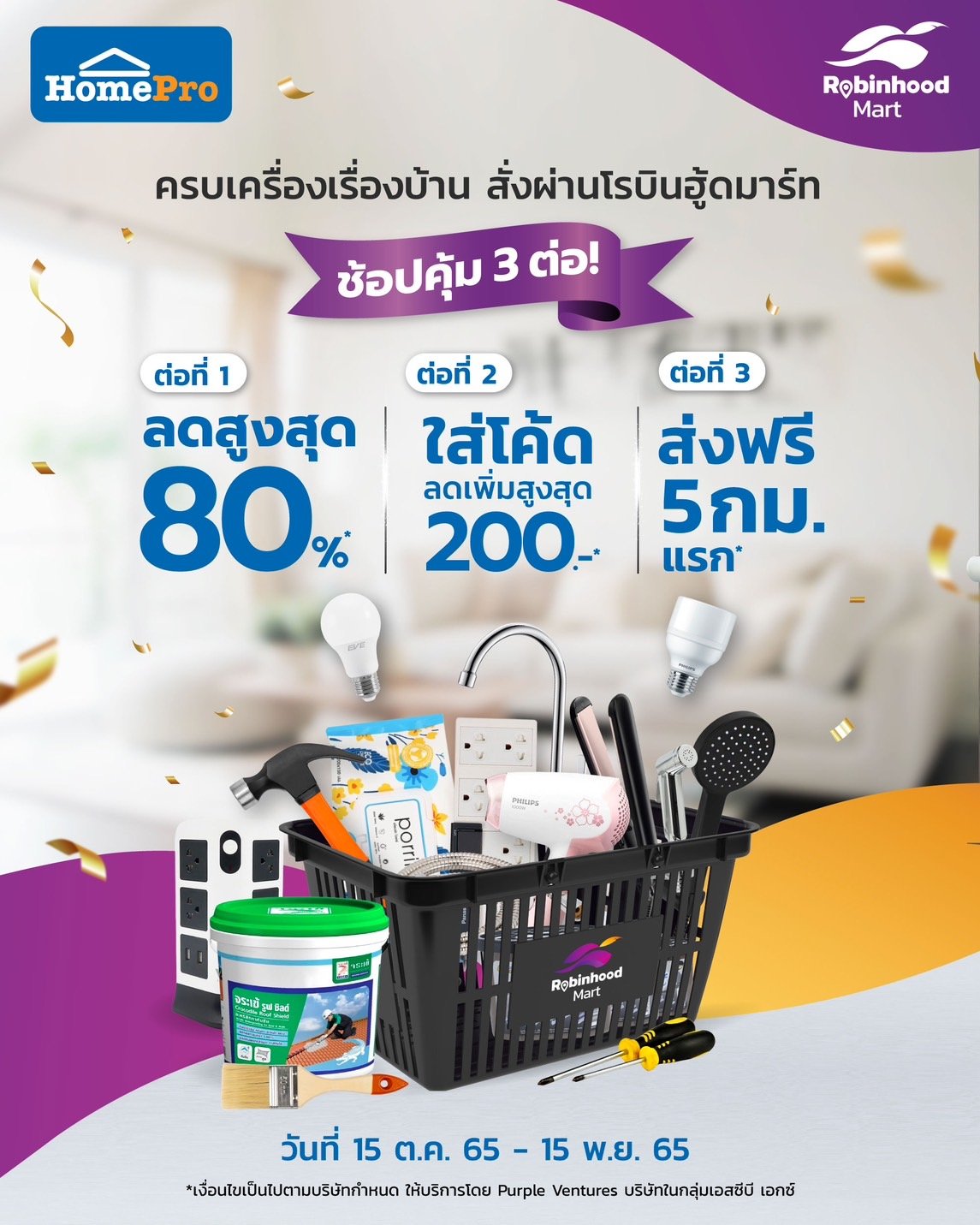 โดยโฮมโปรจะจัดสินค้าเรื่องบ้านครบทุกเซกเม้นต์รวมกว่า 1,000 รายการ ใส่ในโรบินฮู้ด มาร์ท (Robinhood Mart) เอาใจคนรักบ้าน ครบจบทุกเรื่องบ้าน เพื่อให้ลูกค้าสามารถสั่งสินค้าจาก "HomePro" ผ่าน "Robinhood Mart" ส่งไวไม่ต้องรอรอบ ผ่านแคมเปญ "ครบเครื่อง เรื่องบ้าน" พร้อมจัดโปรโมชั่นกระตุ้นตลาดด้วยส่วนลดสุดคุ้ม 3 ต่อ ต่อที่ 1 สินค้าราคาพิเศษ ลดสูงสุด 80% ต่อที่ 2 โค้ดส่วนลดสุดคุ้ม จ่ายเริ่มต้นเพียง 1 บาท หรือลดเพิ่มสูงสุดถึง 200 บาท และต่อที่ 3 ส่งฟรี 5 กิโลเมตรแรก เมื่อสั่งสินค้าจากสาขาที่เข้าร่วมรายการบน "Robinhood Mart" ตั้งแต่วันนี้ ถึงวันที่ 31 ตุลาคมนี้ เท่านั้น