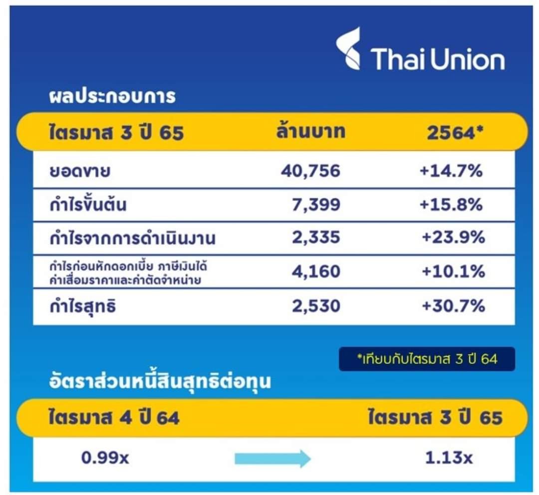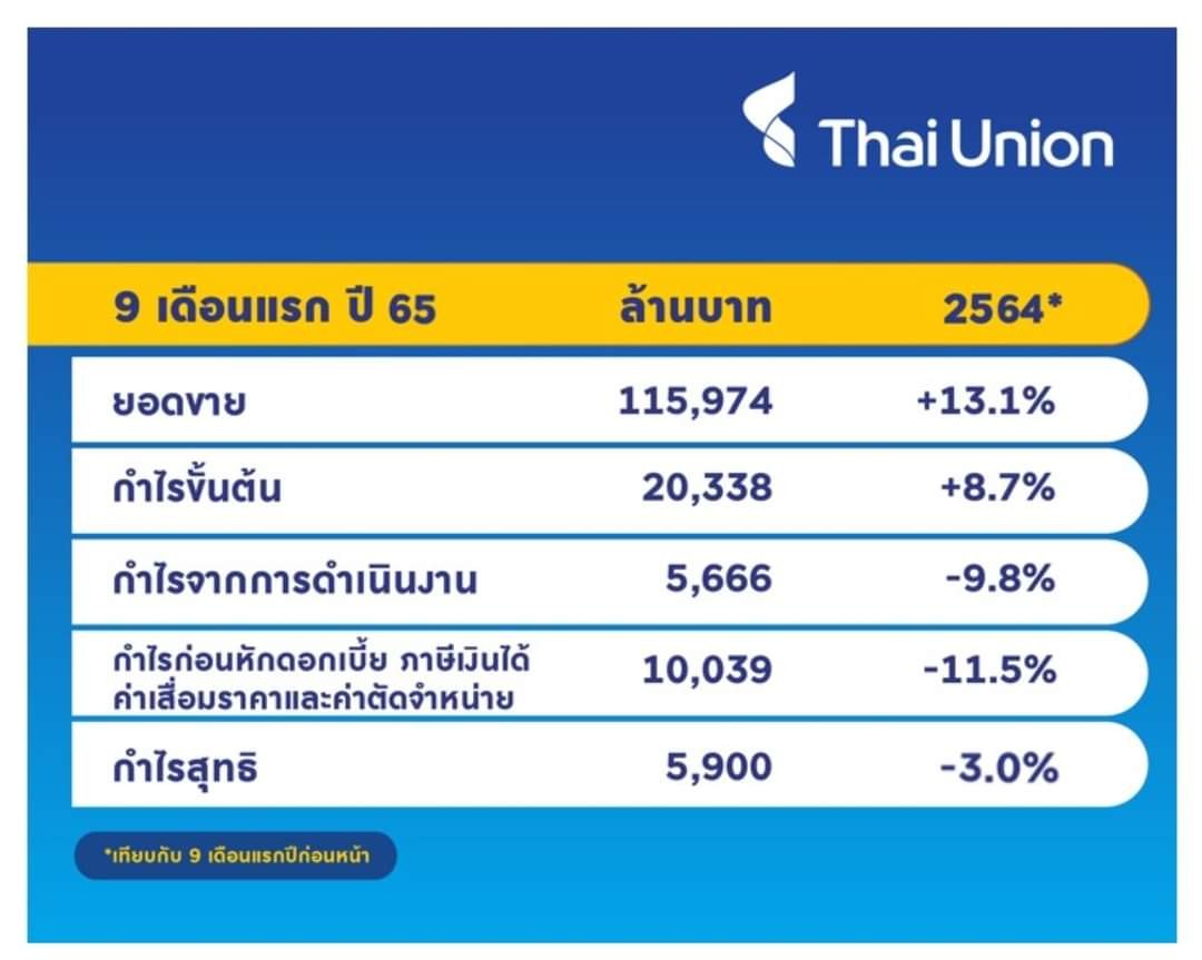 สำหรับผลดำเนินงานช่วง 9 เดือนแรกปีนี้ ยอดขายรวมทำสถิติสูงสุดใหม่ที่ 115,974 ล้านบาท เติบโต 13.1% จากช่วงเดียวกันปีก่อน เป็นการเติบโตในกลุ่มธุรกิจอาหารสัตว์เลี้ยงและผลิตภัณฑ์เพิ่มมูลค่า 42% กลุ่มอาหารทะเลแปรรูป 13% และกลุ่มอาหารทะเลแช่แข็งและแช่เย็น 2% โดยมีกำไรขั้นต้น 20,338 ล้านบาท เติบโต 8.7% และอัตรากำไรขั้นต้นที่ 17.5% ถึงแม้ต้นทุนราคาวัตถุดิบหลักจะปรับขึ้นก็ตาม อย่างไรก็ตาม การที่บริษัทฯ มีส่วนแบ่งขาดทุนจากเงินลงทุนในบริษัทร่วมสูงขึ้น และมีผลขาดทุนจากการด้อยค่าสินทรัพย์ทางการเงินเพิ่มขึ้น ส่งผลให้กำไรสุทธิช่วง 9 เดือนแรกปีนี้ อ่อนตัวลงจากช่วงเดียวกันปีก่อน 3% มาอยู่ที่ 5,899.8 ล้านบาท