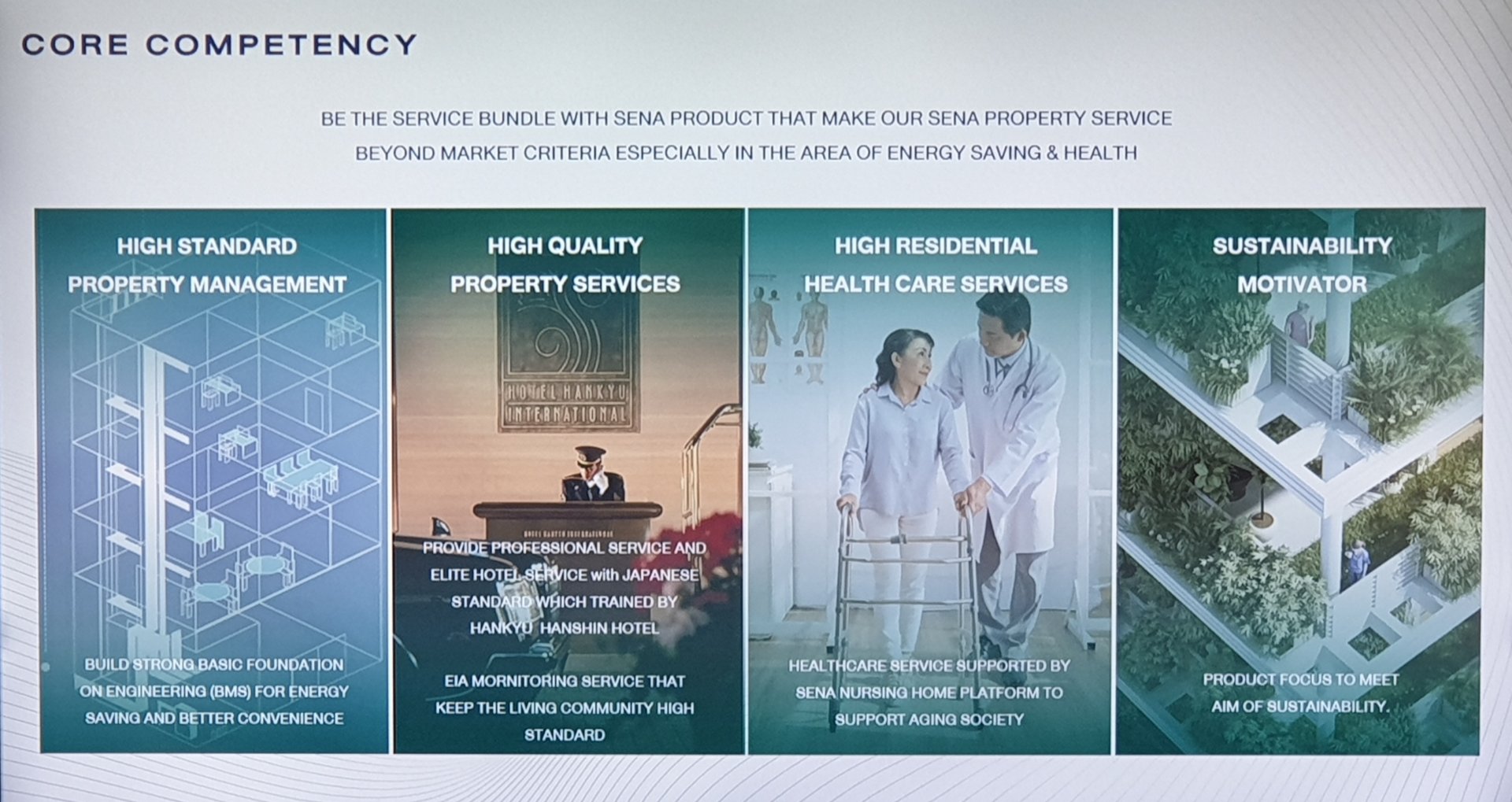 ผศ.ดร. เกษรา ธัญลักษณ์ภาคย์ กรรมการผู้จัดการ บมจ. เสนาดีเวลลอปเม้นท์ (SENA) เปิดเผยว่า บริษัทฯ ได้ดำเนินการปรับโครงสร้างธุรกิจทั้งเครือเสนา เพื่อให้ทุกบริษัทมีความแข็งแกร่ง สามารถเกื้อหนุนซึ่งกันและกัน และช่วยกันเพิ่มขีดความสามารถในการแข่งขันเชิงธุรกิจกับคู่แข่งในตลาด ส่งผลให้แต่ละบริษัทในกลุ่มต้องมีการปรับวิสัยทัศน์และพันธกิจขององค์กร ทำให้ บมจ.เสนา เจ พร็อพเพอร์ตี้ (SENAJ) มีการปรับวิสัยทัศน์ใหม่ให้เป็นสุดยอดของบริษัทผู้ให้บริการอย่างครอบคลุมครบทุกด้านของอสังหาริมทรัพย์ และมีพันธกิจใหม่ในการสร้างสรรค์พัฒนาอสังหาริมทรัพย์และบริการสำหรับกลุ่มเฉพาะ (Niche Market) และกลุ่มลูกค้าระดับไฮเอนด์ รวมถึงผลักดันการขยายบริการด้านที่อยู่อาศัยอย่างครอบคลุมและคุ้มค่า เพื่อมุ่งตอบโจทย์เมกะเทรนด์ (Megatrends) ของโลก เพื่อยกระดับคุณภาพชีวิตด้วยความละเอียดใส่ใจ และจริงจังในการสร้างสังคมที่ยั่งยืน หรือสรุปง่ายๆ ว่า เป็น "To be the ultimate real estate multi-services company"