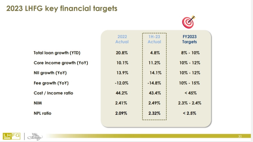 นายฉี ชิง-ฟู่ กรรมการผู้จัดการ บมจ. แอล เอช ไฟแนนซ์เชียล กรุ๊ป (LHFG) เปิดเผยว่า การที่เศรษฐกิจไทยช่วงครึ่งปีแรกขยายตัวตามการฟื้นตัวของการบริโภค การลงทุน และการท่องเที่ยว ส่งผลให้กลุ่มบริษัทฯ มีกำไรสุทธิ 1.2 พันล้านบาท ขยายตัว 61.3% จากช่วงเดียวกันปีก่อน หลักๆ มาจากธนาคารแลนด์ แอนด์ เฮ้าส์ (LH Bank) ที่มีกําไรสุทธิเติบโตก้าวกระโดด 119% เป็น 943.6 ล้านบาท หนุนโดยการขยายสินเชื่อที่เติบโตจากครึ่งแรกปีก่อน 4.8% และการเพิ่มขึ้นของส่วนต่างดอกเบี้ยสุทธิ (NIM) ขานรับนโยบายดอกเบี้ยขาขึ้น