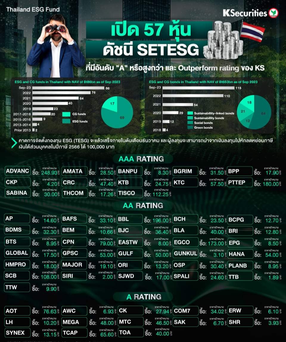 ในจำนวน 22 กองทุน Thai ESG มี บลจ. กรุงไทย (KTAM) และ บลจ. ไทยพาณิชย์ (SCBAM) ที่ออกกองทุน Thai ESG มากสุด แห่งละ 3 กองทุน โดแทบทุกกองทุนจะเน้นลงทุนในหุ้นที่ติดอยู่ในลิสต์ดัชนี SET ESG ที่มีอันดับ A หรือสูงกว่า จำนวน 57 หุ้น ดังนี้