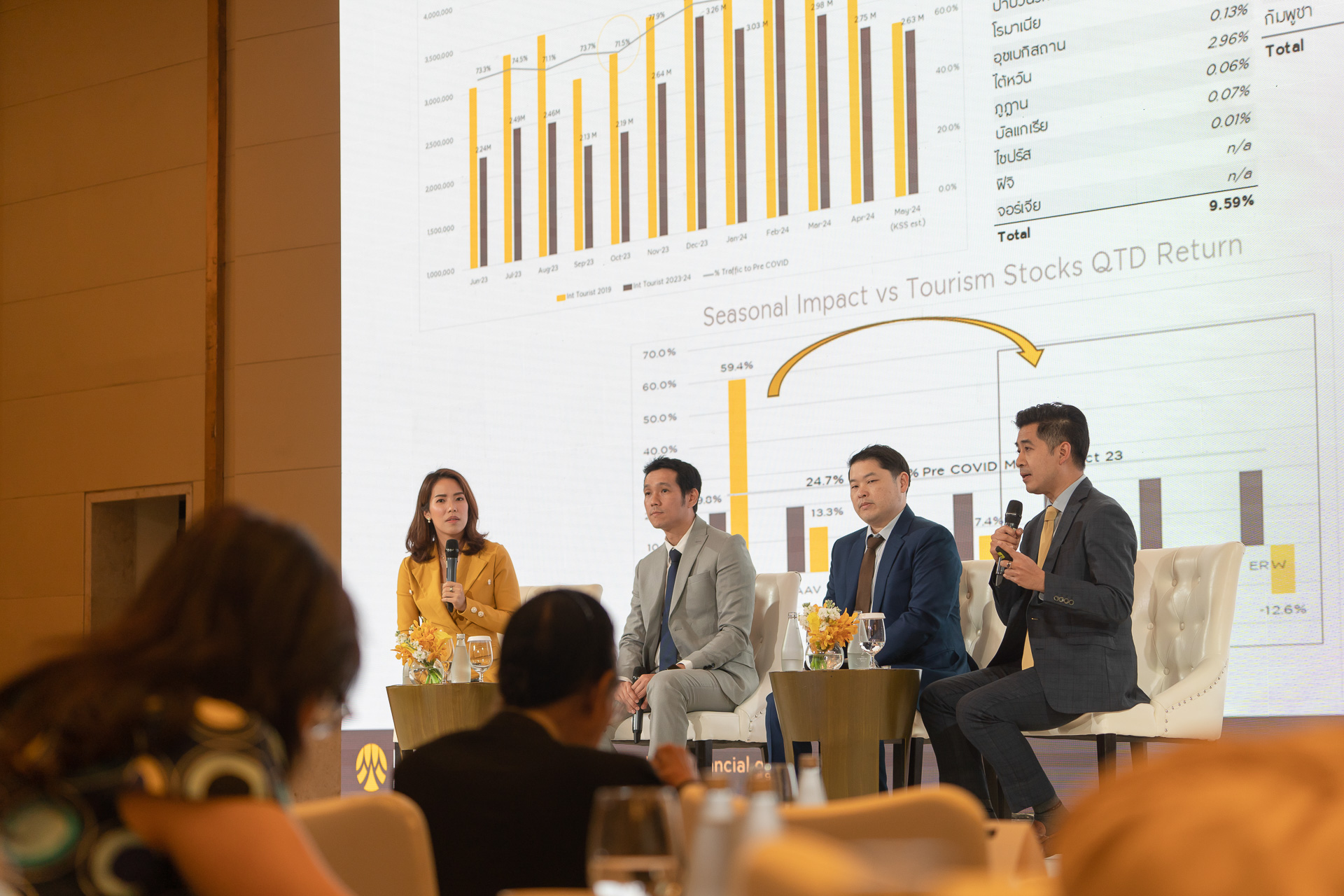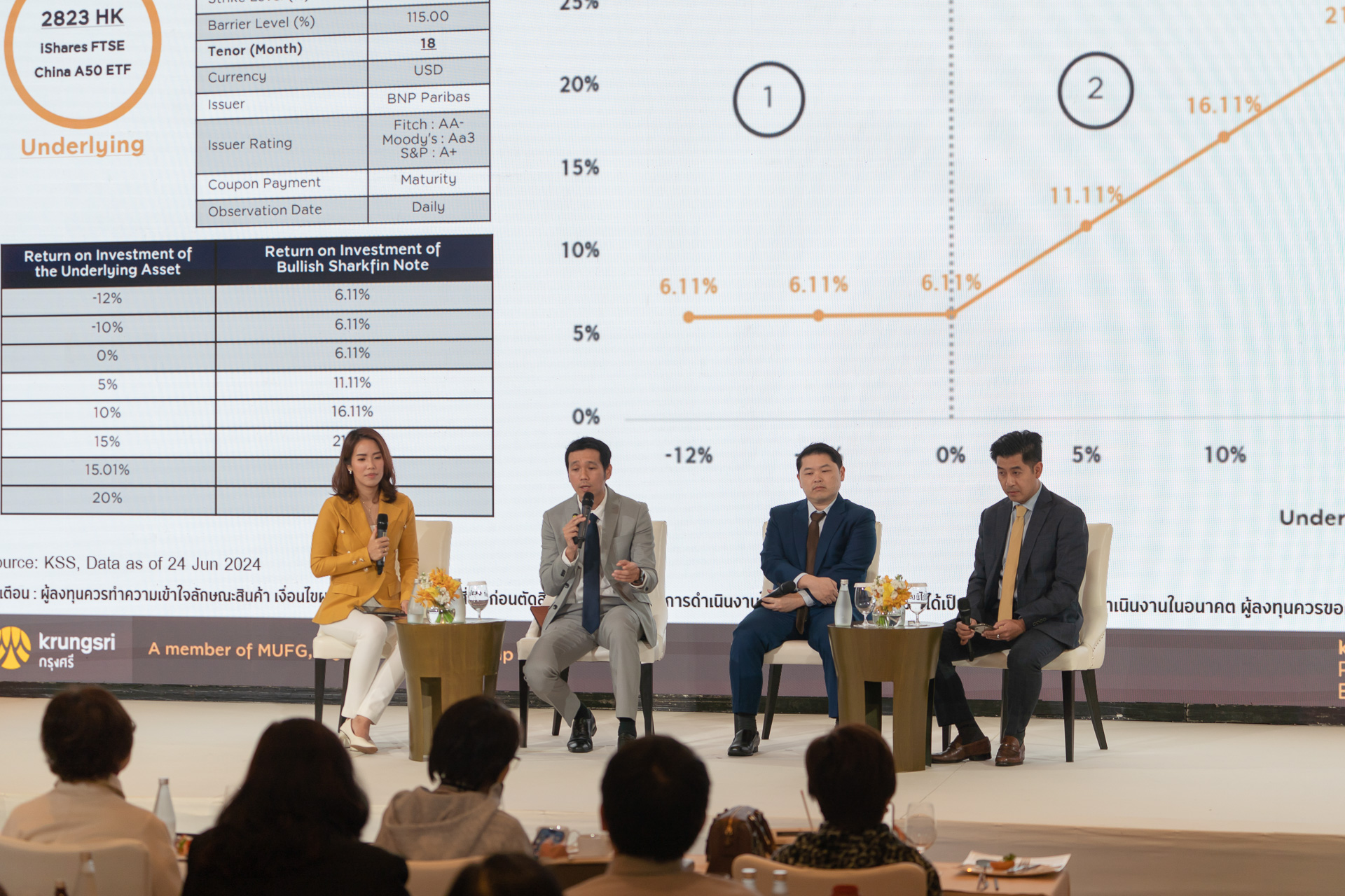 ส่วนนายวิรัตน์ วิทยศรีธาดา หัวหน้าทีม Krungsri Investment Intelligence แนะนำกระจายเงินลงทุนใน 4 ธีม ธีมแรก FED ลดดอกเบี้ยช่วง 1-3 ปีนี้ ด้วยการลงทุนกองทุนตราสารหนี้ อย่าง PIMCO GIS Income Fund (KF-CSINCOM) ที่กระจายการลงทุนตราสารหนี้ทั่วโลกและมีผลดำเนินงานที่ดีสม่ำเสมอ ธีมที่สอง การลงทุนหุ้น แบ่งเป็นการลงทุนหุ้นทั่วโลก อย่างกองทุน BlackRock World Technology Fund A2 USD (KFHTECH) ที่ลงทุนในหุ้นเทคโนโลยีขนาดใหญ่ที่มีผลดำเนินงานและอัตราการเติบโตสูงกว่าตลาดหุ้นโดยรวม กับการลงทุนหุ้นเวียดนาม ซึ่งมีการเติบโตสูงและมีปัจจับหนุนเฉพาะตัวจากการถูกยกระดับขึ้นเป็นตลาดหุ้นเกิดใหม่ (Emerging Markets) ผ่านกองทุน Principal VNEQ จะช่วยสร้างผลตอบแทนที่ดี