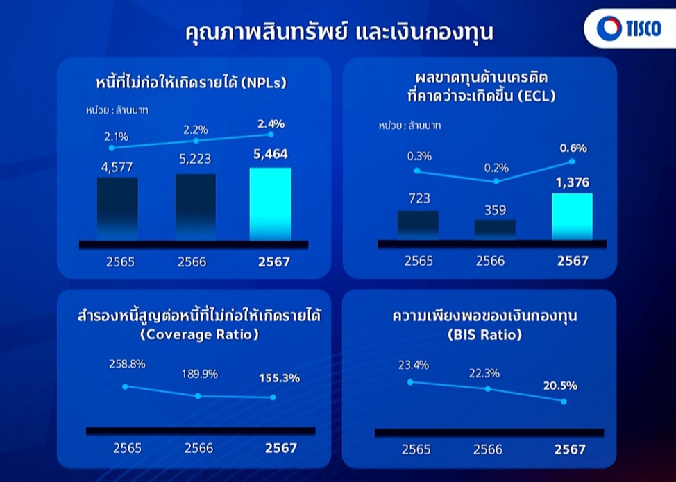 สำหรับผลดำเนินงานทั้งปี กลุ่มบริษัทฯ มีกำไรสุทธิ 6,901.28 ล้านบาท ลดลง 5.5% จากช่วงเดียวกันปีก่อน ตามการชะลอตัวของพอร์ตสินเชื่อที่ลดลง 1.1% มาอยู่ที่ 2.32 แสนล้านบาท หลักๆ มาจากสินเชื่อเช่าซื้อรถยนต์ใหม่ สินเชื่อเพื่อที่อยู่อาศัย และสินเชื่อธุรกิจขนาดกลางและย่อม (SMEs) และความตั้งใจตั้งสำรองหนี้เพิ่มจากปีก่อน 0.60% ของสินเชื่อรวม ซึ่งจะทำให้ Credit costs ขยับสู่ระดับปกติที่ 100-120 bps และมี coverage ratio ไม่ต่ำกว่า 140% พร้อมรับมือความเสี่ยงจากเศรษฐกิจฟื้นตัวช้า และแผนขยายสินเชื่อในปี 2568 ถึงแม้จะมีผลกระทบให้หนี้เสีย (NPL) ปรับเพิ่มขึ้นบ้างก็ตาม หลังจากที่สามารถควบคุมให้ลดจาก 2.44% ในไตรมาส 3 มาอยู่ที่ 2.35% แต่เพิ่มขึ้นจาก 2.22% ในปีก่อน โดยเงินกองทุนต่อสินทรัพย์เสี่ยงอยู่ในระดับ 18.6% ในจำนวนนี้เป็นเงินกองทุนขั้นที่ 1 ที่ระดับ 17.0% แต่หากแยกเฉพาะธุรกิจธนาคาร เงินกองทุนต่อสินทรัพย์เสี่ยงอยู่ที่ 20.5% ในจำนวนนี้เป็นเงินกองทุนขั้นที่ 1 ที่ระดับ 18.7%