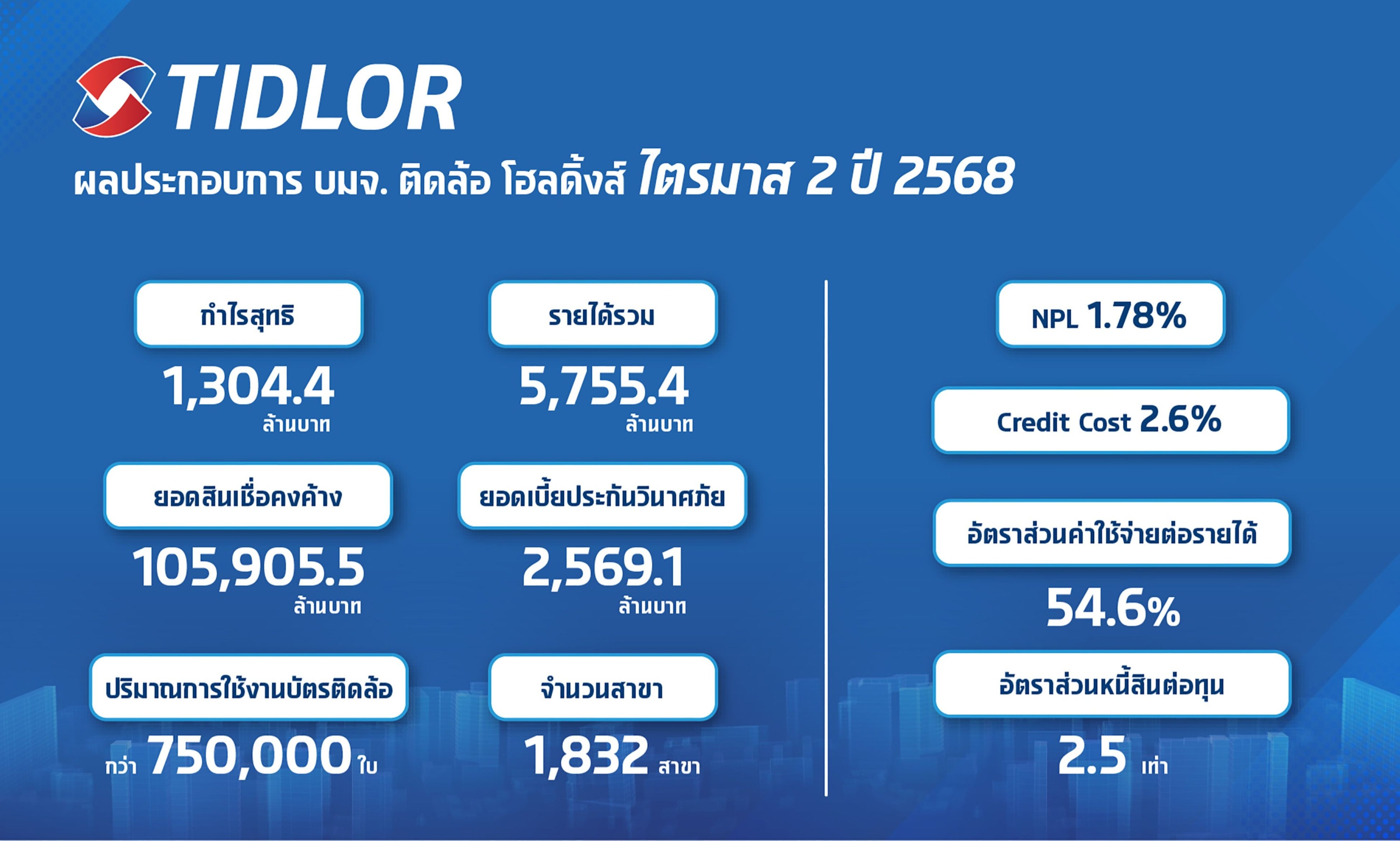 บมจ. ติดล้อ โฮลดิ้งส์ (TIDLOR) รายงานผลดำเนินงานงวดไตรมาส 2 ปี 2568 มีกำไรสุทธิ 1,647 ล้านบาท เพิ่มขึ้น 19.5% จากช่วงเดียวกันปีก่อน (YoY) และเพิ่มขึ้น 8.2% จากไตรมาสก่อนหน้า (QoQ) ทำสถิติสูงสุดรายไตรมาส ตามการเติบโตทั้งในธุรกิจสินเชื่อ และประกันภัย ผลักดันให้รายได้ดอกเบี้ยรับสุทธิเพิ่มขึ้น ตามการขยายสินเชื่อเพิ่ม 2.8% YoY และ 1.1% QoQ เป็น 1.05 แสนล้านบาท และรายได้ค่าธรรมเนียมและบริการที่เพิ่มขึ้น 10.6% YoY และ 1.2% QoQ มาอยู่ที่ 994 ล้านบาท หลักๆ จากธุรกิจนายหน้าประกันภัย อีกทั้งการบริหารจัดการต้นทุนและความเสี่ยงอย่างมีประสิทธิภาพ ทำให้ผลขาดทุนด้านเครดิตต่อเงินให้สินเชื่อ (Credit Cost) ลดลงจาก 3.6% ในไตรมาส 2 ปีก่อน และ 3.0% ในไตรมาสแรก มาอยู่ที่ 2.6% ขณะที่หนี้เสีย (NPL) สามารถควบคุมได้ที่ 1.8% ใกล้เคียงไตรมาส 2 ปีก่อน และไตรมาสแรกปีนี้
