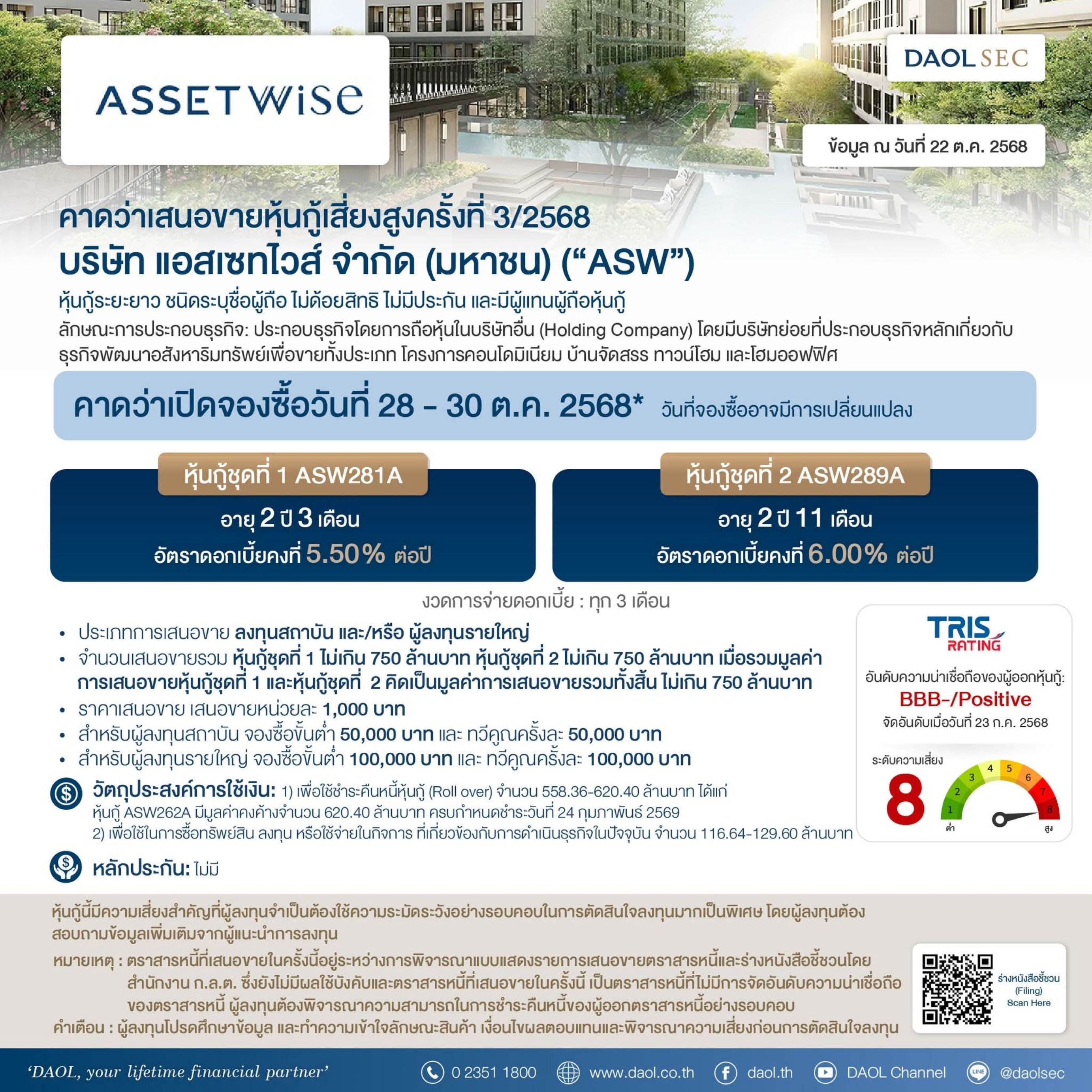 บมจ. แอสเซทไวส์ (ASW) เตรียมเสนอขายหุ้นกู้ครั้งที่ 3 ของปี 2568 เป็นหุ้นกู้ไม่ด้อยสิทธิ ไม่มีประกัน และมีผู้แทนถือหุ้นกู้ จำนวน 2 ชุด ชุดแรก อายุ 2 ปี 3 เดือน อัตราดอกเบี้ยปีละ 5.50% และชุดที่ 2 อายุ 2 ปี 11 เดือน อัตราดอกเบี้ยปีละ 6.00% จ่ายดอกเบี้ยทุก 3 เดือน ให้กับนักลงทุนสถาบัน และนักลงทุนรายใหญ่ ระหว่างวันที่ วันที่ 28 – 30 ตุลาคมนี้ วงเงินรวม 750 ล้านบาท ผ่านผู้จัดการการจัดจำหน่ายหุ้นกู้ 15 ราย คือ บมจ. หลักทรัพย์ ยูโอบี เคย์เฮียน (UOBKH) บมจ. หลักทรัพย์ ฟิลลิป ประเทศไทย (PST) บมจ. หลักทรัพย์ ดาโอ ประเทศไทย (DAOL) บมจ. หลักทรัพย์ เมอร์ชั่น พาร์ทเนอร์ (MPS) บมจ. หลักทรัพย์ บียอนด์ (BYD) บมจ. หลักทรัพย์ พาย (Pi) บมจ. หลักทรัพย์ เคจีไอ ประเทศไทย (KGI) บมจ. หลักทรัพย์ เมย์แบงก์ ประเทศไทย (MST) บมจ. หลักทรัพย์ ฟินันเซีย ไซรัส (FSS) บริษัทหลักทรัพย์ เอเซีย พลัส (ASP) บริษัทหลักทรัพย์ กรุงไทย เอ็กซ์สปริง (KTX) บริษัทหลักทรัพย์ โกลเบล็ก (GBS) บริษัทหลักทรัพย์ ซีจีเอส อินเตอร์เนชั่นแนล (CGSI) บริษัทหลักทรัพย์ บลูเบลล์ (BLUEBELL) และบริษัทหลักทรัพย์ หยวนต้า ประเทศไทย (YUANTA)