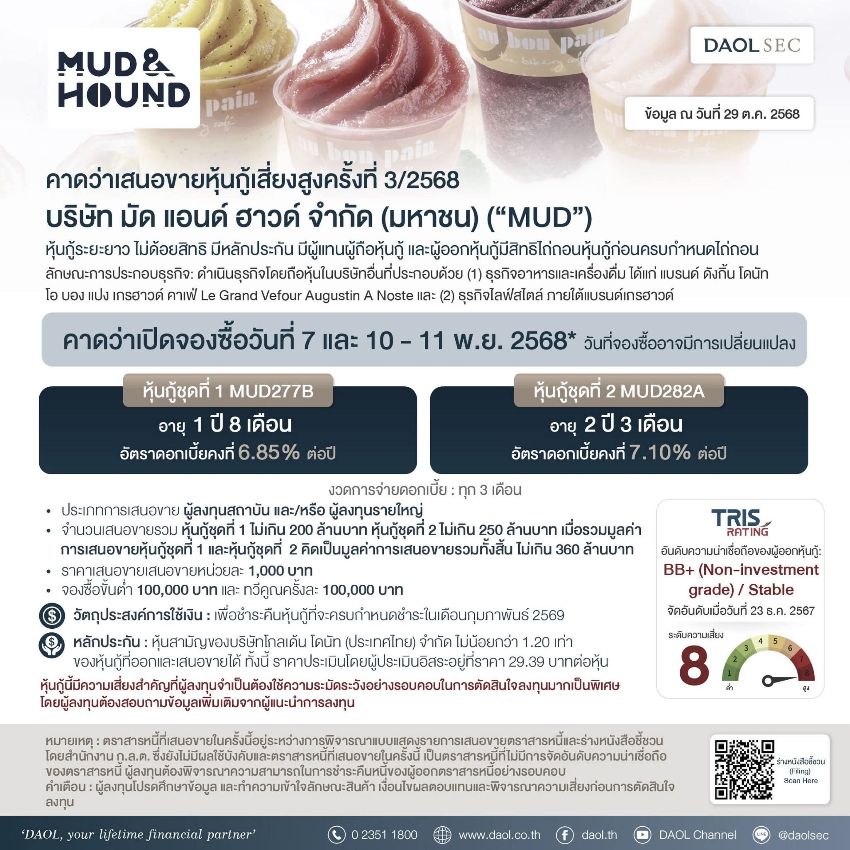 บมจ. มัด แอนด์ ฮาวด์ (MUD) เตรียมเปิดขายหุ้นกู้ครั้งที่ 3 ของปี 2568 เป็นหุ้นกู้ไม่ด้อยสิทธิ มีประกัน (หลักประกันเป็นหุ้นสามัญบริษัท โกลเด้น โดนัท ประเทศไทย คิดเป็นมูลค่าหลักประกันไม่ต่ำกว่า 1.40 เท่า ของมูลค่าหุ้นกู้ที่เสนอขาย) และมีสิทธิไถ่ถอนก่อนครบกำหนด จำนวน 2 ชุด อายุ 1 ปี 8 เดือน อัตราดอกเบี้ยปีละ 6.85% และอายุ 2 ปี 3 เดือน อัตราดอกเบี้ยปีละ 7.10% จ่ายดอกเบี้ยทุก 3 เดือน ให้กับนักลงทุนสถาบัน และนักลงทุนรายใหญ่ ระหว่างวันที่ 7 และ 10-11 พฤศจิกายนนี้ วงเงินรวมไม่เกิน 360 ล้านบาท ผ่านผู้จัดการการจัดจำหน่ายหุ้นกู้ 4 ราย คือ บริษัทหลักทรัพย์ เอเซีย พลัส (ASP) บริษัทหลักทรัพย์บลูเบลล์ (BLUEBELL) บมจ. หลักทรัพย์ ดาโอ ประเทศไทย (DAOL) และ บมจ. หลักทรัพย์ ยูโอบี เคย์เฮียน ประเทศไทย (UOBKH) โดยมีวัตถุประสงค์เพื่อนำเงินที่ได้ไปใช้ไถ่ถอนหุ้นกู้ที่จะครบกำหนดในเดือนกุมภาพันธ์นี้