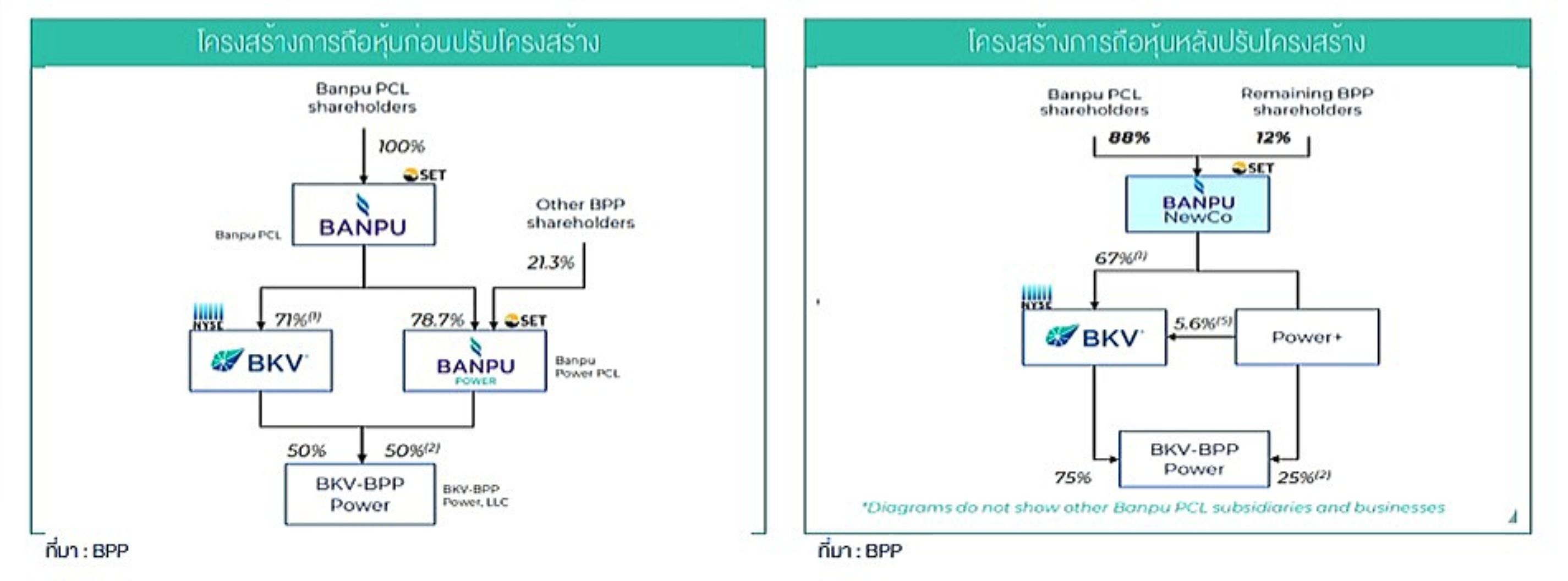 สำหรับแผนปรับโครงสร้างธุรกิจครั้งนี้ จะประกอบด้วย 2 ส่วนหลัก ส่วนแรก เป็นการปรับโครงสร้างเงินลงทุนระหว่าง BPP และ BKV ในบริษัท BKV-BPP Power เพื่อปรับโครงสร้างการถือครองสินทรัพย์โรงไฟฟ้าก๊าซธรรมชาติ Temple I&II ในอเมริกา ให้สอดคล้องกับโครงสร้างหลังควบรวมกิจการ โดย BKV จะเข้าซื้อหุ้น 25% จาก BPP ด้วยมูลค่ารวม 376 ล้านดอลลาร์สหรัฐ (ราว 1.2 หมื่นล้านบาท) แบ่งเป็นการจ่ายเงินสดครึ่งหนึ่ง และหุ้นสามัญเพิ่มทุนของ BKV ที่ราคาหุ้นละ 21.66 ดอลลาร์สหรัฐฯ อีกครึ่งหนึ่ง ส่งผลให้ BKV มีสัดส่วนการถือหุ้นใน BKV-BPP Power เพิ่มเป็น 75% ขณะที่ BPP ถือหุ้น 25% ซึ่งธุรกรรมนี้น่าจะแล้วเสร็จภายในไตรมาสแรกปี 2569 ส่งผลให้ BPP มีกระแสเงินสดรองรับการลงทุนในอนาคต พร้อมทั้งปลดล๊อคมูลค่าหุ้นทั้ง BANPU และ BPP ได้ในระดับหนึ่ง