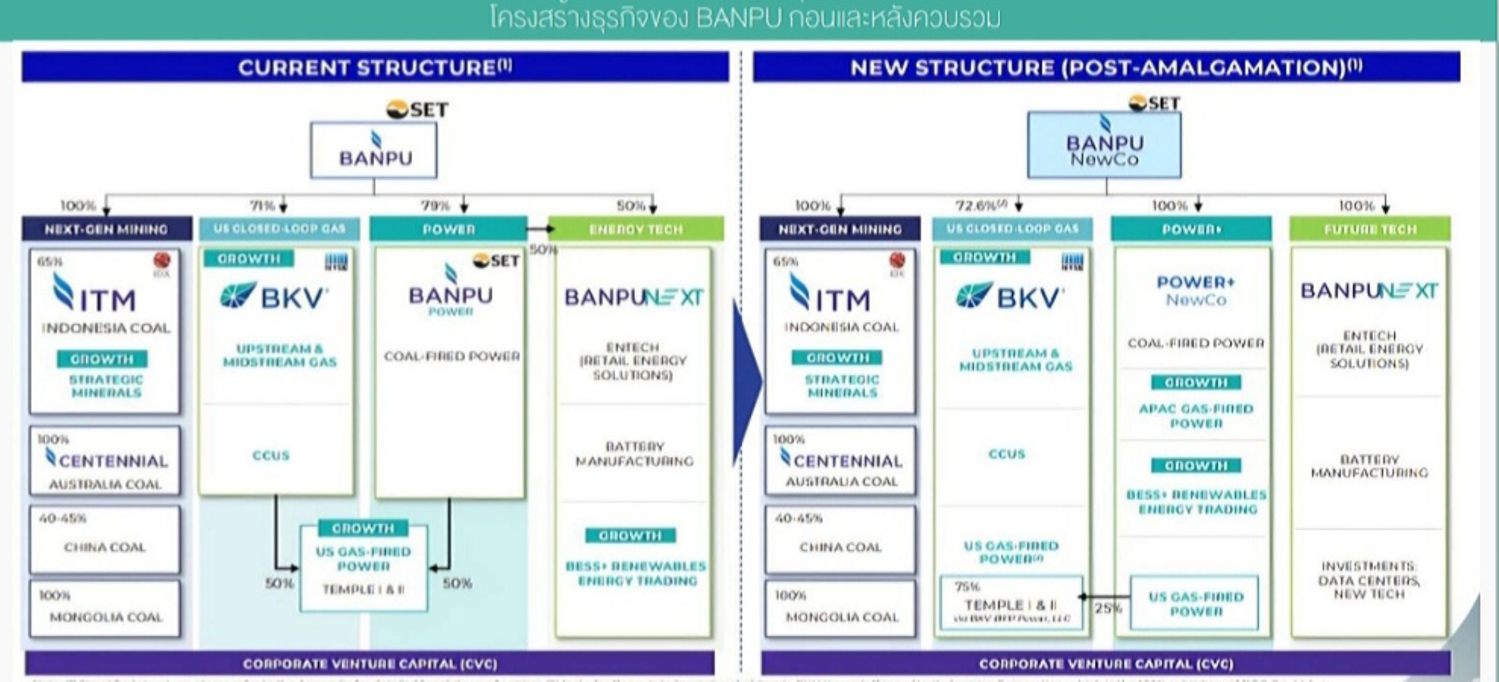 หลังจากที่ประชุมคณะกรรมการ บมจ. บ้านปู BANPU) มีมติเห็นชอบในการปรับโครงสร้างธุรกิจภายในกลุ่ม ด้วยการควบรวมกิจการระหว่าง BANPU และ บมจ. บ้านปู เพาเวอร์ (BPP) เข้าด้วยกันภายใต้บริษัทใหม่บริษัทเดียว (NewCo) โดยให้เหตุผลว่า จะช่วยเพิ่มศักยภาพในการดำเนินธุรกิจพลังงานครบวงจรให้มีความแข็งแกร่งมากขึ้น ทั้งการวางกลยุทธ์ที่ชัดเจนเป็นหนึ่งเดียว ครอบคลุมตั้งแต่ต้นน้ำ (เหมืองถ่านหิน ก๊าซธรรมชาติ) ไปจนถึงปลายน้ำ (พลังงานหมุนเวียน โครงสร้างพื้นฐานด้านพลังงาน) ภายใต้ 4 เสาหลัก (Four Core Pillars) ทำให้การดำเนินธุรกิจมีความคล่องตัวมากขึ้น สามารถลดต้นทุนดำเนินงาน ลดความซับซ้อนจากการถือหุ้นไขว้ระหว่าง 2 องค์กร ช่วยปลดล็อกมูลค่าของกลุ่มพลังงานไฟฟ้าที่กระจัดกระจายอยู่ในหลายบริษัท และเพิ่มความเข้มแข็งทางการเงิน เพื่อเตรียมขยายโอกาสไปในธุรกิจที่มีศักยภาพการเติบโตในระยะยาว ไม่ว่าจะเป็น ธุรกิจ Data Center ระบบกักเก็บพลังงาน (Energy Storage System - ESS) หรือธุรกิจพลังงานหมุนเวียนเทคโนโลยีใหม่ๆ เพิ่มสัดส่วนกำไรจากธุรกิจที่ไม่ใช่ถ่านหิน (Non-coal) ให้สูงขึ้น พร้อมสร้างผลตอบแทนที่คุ้มค่าให้กับผู้ถือหุ้น และนักลงทุน ได้อย่างยั่งยืน