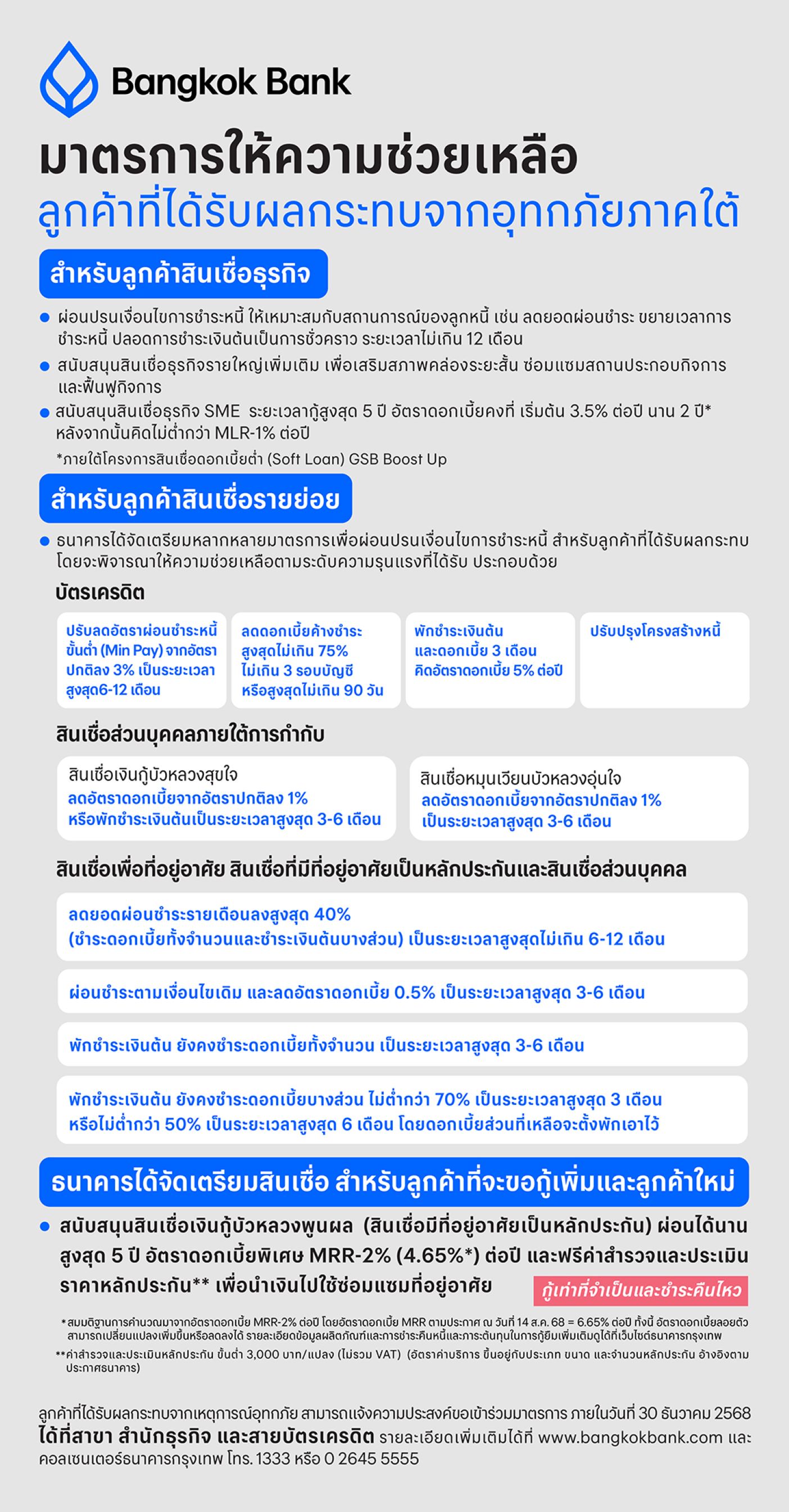 พร้อมกันนี้ ธนาคารยังได้ออกมาตรการบรรเทาภาระทางการเงิน ครอบคลุมการลดดอกเบี้ย ลดค่างวดชำระหนี้ และเสริมสภาพคล่องสำหรับการดำรงชีพและการซ่อมแซมทรัพย์สินที่ได้รับความเสียหาย เพื่อให้ทุกภาคส่วนสามารถฟื้นตัวได้อย่างรวดเร็วและยั่งยืน โดยลูกค้าที่ประสงค์รับความช่วยเหลือ สามารถติดต่อสาขาธนาคารกรุงไทยทั่วประเทศได้ตั้งแต่วันนี้ จนถึงสิ้นปี 2568 หรือสอบถามข้อมูลเพิ่มเติมที่ Contact Center โทร. 1333 หรือ 02-645-5555