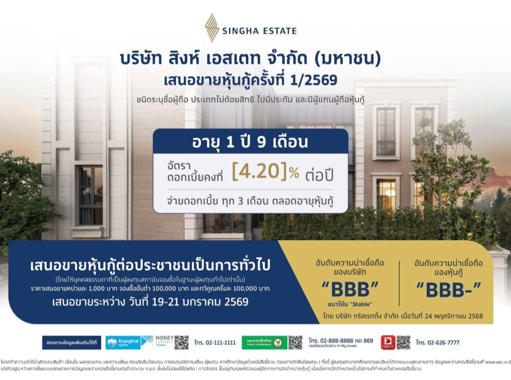นายชัยรัตน์ ศิวะพรพันธ์ ประธานเจ้าหน้าที่บริหาร บมจ. สิงห์ เอสเตท (S) เปิดเผยว่า บริษัทฯ สามารถปิดยอดขายหุ้นกู้ครั้งแรกของปี 2569 อายุ 1 ปี 9 เดือน อัตราดอกเบี้ยปีละ 4.20% จ่ายดอกเบี้ยทุก 3 เดือน ซึ่งเปิดขายนักลงทุนทั่วไป ระหว่างวันที่ 19 -21 มกราคมที่ผ่านมา ผ่านผู้จัดจำหน่าย 3 ราย คือ บมจ. ธนาคารกสิกรไทย บมจ. ธนาคารกรุงไทย (KTB) และ บมจ. ธนาคารซีไอเอ็มบี ไทย (CIMBT) ได้ครบตามเป้าหมาย 1,500 ล้านบาทแล้ว สะท้อนให้เห็นถึงความเชื่อมั่นของกลุ่มนักลงทุนที่มีต่อศักยภาพและทิศทางการดำเนินธุรกิจของบริษัทฯ ที่ยังคงสามารถขับเคลื่อนการเติบโตได้ตามแผนที่วางไว้ ท่ามกลางความท้าทายจากภาวะเศรษฐกิจ และการแข่งขันในตลาดอสังหาริมทรัพย์