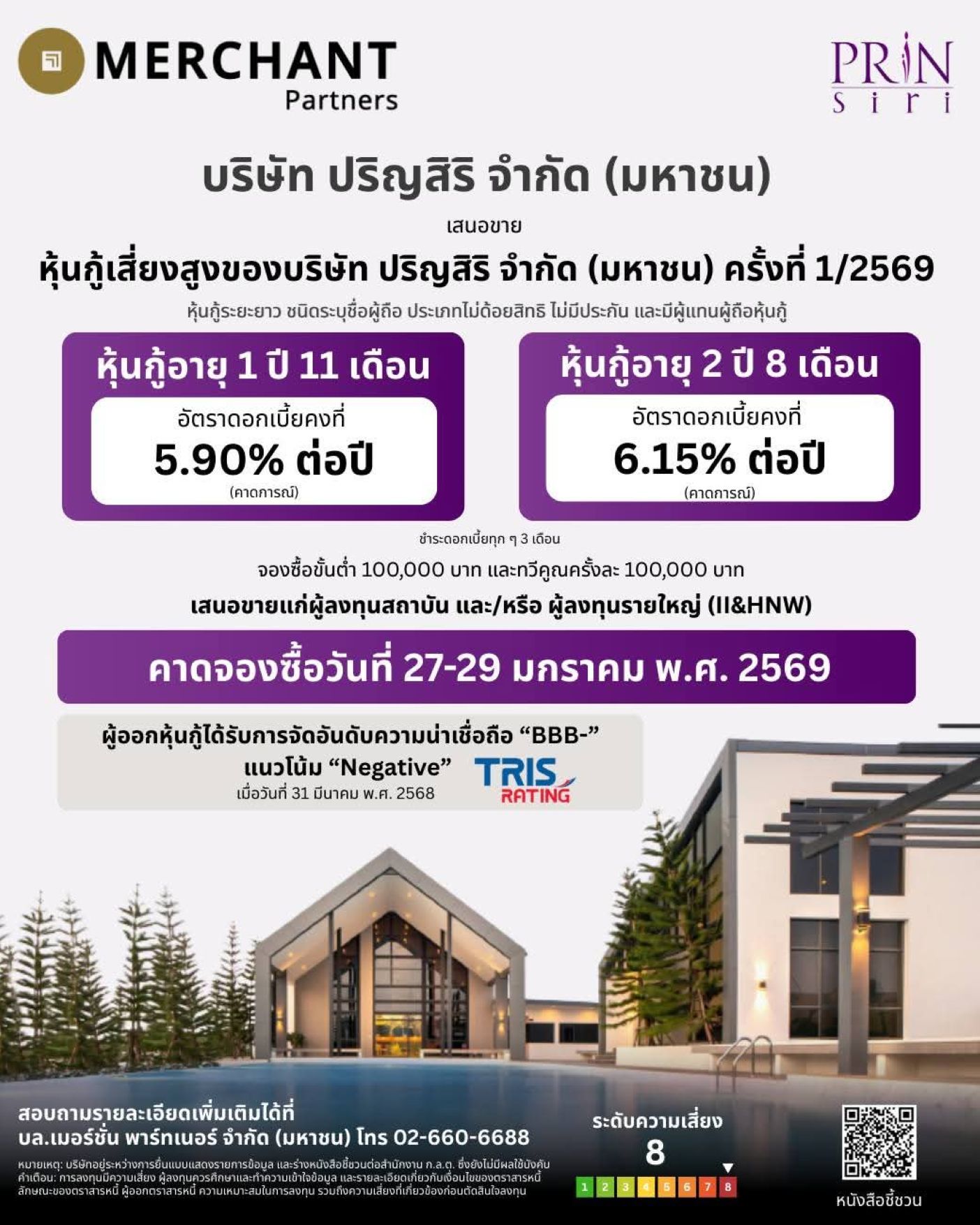 บมจ. ปริญสิริ (PRIN) เตรียมเสนอขายหุ้นกู้ครั้งแรกของปี 2569 เป็นหุ้นกู้ไม่ด้อยสิทธิ ไม่มีประกัน จำนวน 2 ชุด ชุดแรกอายุ 1 ปี 11 เดือน อัตราดอกเบี้ยปีละ 5.90% และชุดที่ 2 อายุ 2 ปี 8 เดือน อัตราดอกเบี้ยปีละ 6.15% จ่ายดอกเบี้ยทุก 3 เดือน ให้กับนักลงทุนสถาบัน และนักลงทุนรายใหญ่ ระหว่างวันที่ 27 – 29 มกราคม วงเงินรวม 250 ล้านบาท ผ่านผู้จัดการการจัดจำหน่ายหุ้นกู้ 9 ราย ได้แก่ บริษัทหลักทรัพย์ บลูเบลล์ (BLUEBELL) บริษัทหลักทรัพย์ โกลเบล็ก (GBS) บริษัท หลักทรัพย์ ซีจีเอส อินเตอร์เนชั่นแนล ประเทศไทย (CGSI) บริษัทหลักทรัพย์ เอเซีย พลัส (ASPS) บมจ. หลักทรัพย์ ดาโอ ประเทศไทย (DAOL) บมจ. หลักทรัพย์ เมอร์ชั่น พาร์ทเนอร์ (MPS) บมจ. หลักทรัพย์ เมย์แบงก์ ประเทศไทย (MST) บมจ. หลักทรัพย์ พาย (Pi) และ บมจ. หลักทรัพย์ ยูโอบี เคย์เฮียน ประเทศไทย (UOBKH)