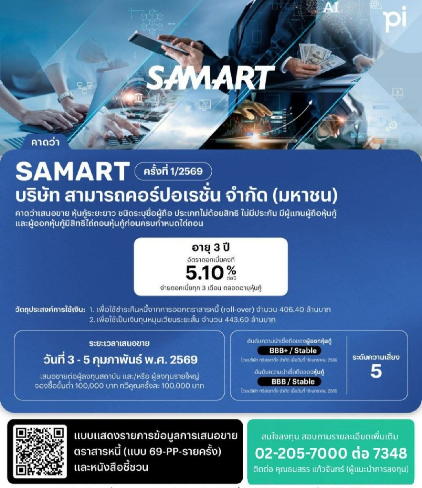 บมจ. สามารถคอร์ปอเรชั่น (SAMART) เตรียมเสนอขายหุ้นกู้ครั้งแรกของปี 2569 เป็นหุ้นกู้ไม่ด้อยสิทธิ ไม่มีประกัน และมีสิทธิไถ่ถอนก่อนครบกำหนด อายุ 3 ปี อัตราดอกเบี้ยปีละ 5.10% จ่ายดอกเบี้ยทุก 3 เดือน ให้กับนักลงทุนสถาบัน และนักลงทุนรายใหญ่ ระหว่างวันที่ 3 – 5 กุมภาพันธ์นี้ วงเงินรวม 850 ล้านบาท ผ่านผู้จัดการการจัดจำหน่ายหุ้นกู้ 9 ราย ได้แก่ บมจ. หลักทรัพย์ ดาโอ ประเทศไทย (DAOL) บมจ. หลักทรัพย์ ฟินันเซีย ไซรัส (FSS) บมจ. หลักทรัพย์ บียอนด์ (BYD) บมจ. หลักทรัพย์ ฟิลลิป ประเทศไทย (PLS) บมจ. หลักทรัพย์ พาย (Pi) บริษัทหลักทรัพย์ บลูเบลล์ (BLUEBELL) บริษัทหลักทรัพย์ โกลเบล็ก (GBS) บริษัทหลักทรัพย์ อพอลโล่ เวลธ์ (APOLLO) และบริษัทหลักทรัพย์ เอเซีย พลัส (ASPS)