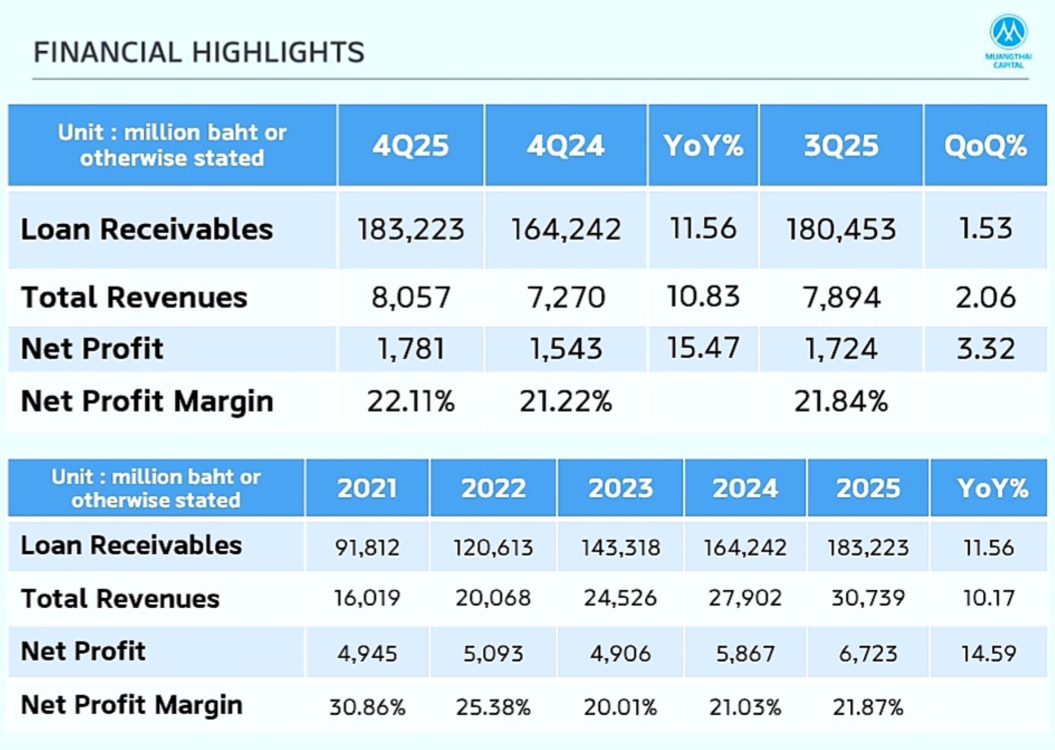สำหรับผลดำเนินงานปี 2568 บริษัทฯ มีกำไรสุทธิ 6,723 ล้านบาท เพิ่มขึ้น 14.6% จากปีก่อนหน้า หนุนจากสินเชื่อที่ขยายตัว 11.6% และการเปิดสาขาใหม่ที่ครอบคลุมพื้นที่ให้บริการมากขึ้น ผลักดันให้รายได้ดอกเบี้ยสุทธิเพิ่มขึ้น และการควบคุมคุณภาพสินเชื่อได้ดีขึ้น ทำให้ credit cost ลดลง ส่งผลให้รายได้รวมเพิ่มขึ้น 10.2% เป็น 30,739 ล้านบาท อีกทั้งอัตรากำไรสุทธิเร่งตัวขึ้น 0.9% มาอยู่ที่ 21.9% ส่วนหนึ่งเป็นความสำเร็จจากผลงานในงวดไตรมาสสุดท้ายของปี ที่บริษัทฯ สามารถขยายสินเชื่อได้เพิ่มขึ้น 3% จากไตรมาสก่อนหน้า (QoQ) และ 13% จากช่วงเดียวกันปีก่อน (YoY) และการควบคุมคุณภาพหนี้ได้อย่างมีประสิทธิภาพ ทำให้ทั้ง credit cost และ NPL ลดลง ผลักดันให้กำไรสุทธิสูงขึ้น 3% QoQ และสูงขึ้น 15% YoY เป็น 1,781 ล้านบาท และเตรียมจ่ายเงินปันผลในอัตราหุ้นละ 0.29 บาท กำหนดวันที่ไม่ได้รับสิทธิปันผล (วันขึ้น XD) 28 เมษายน และกำหนดจ่ายเงินวันที่ 25 พฤษภาคมที่จะถึงนี้