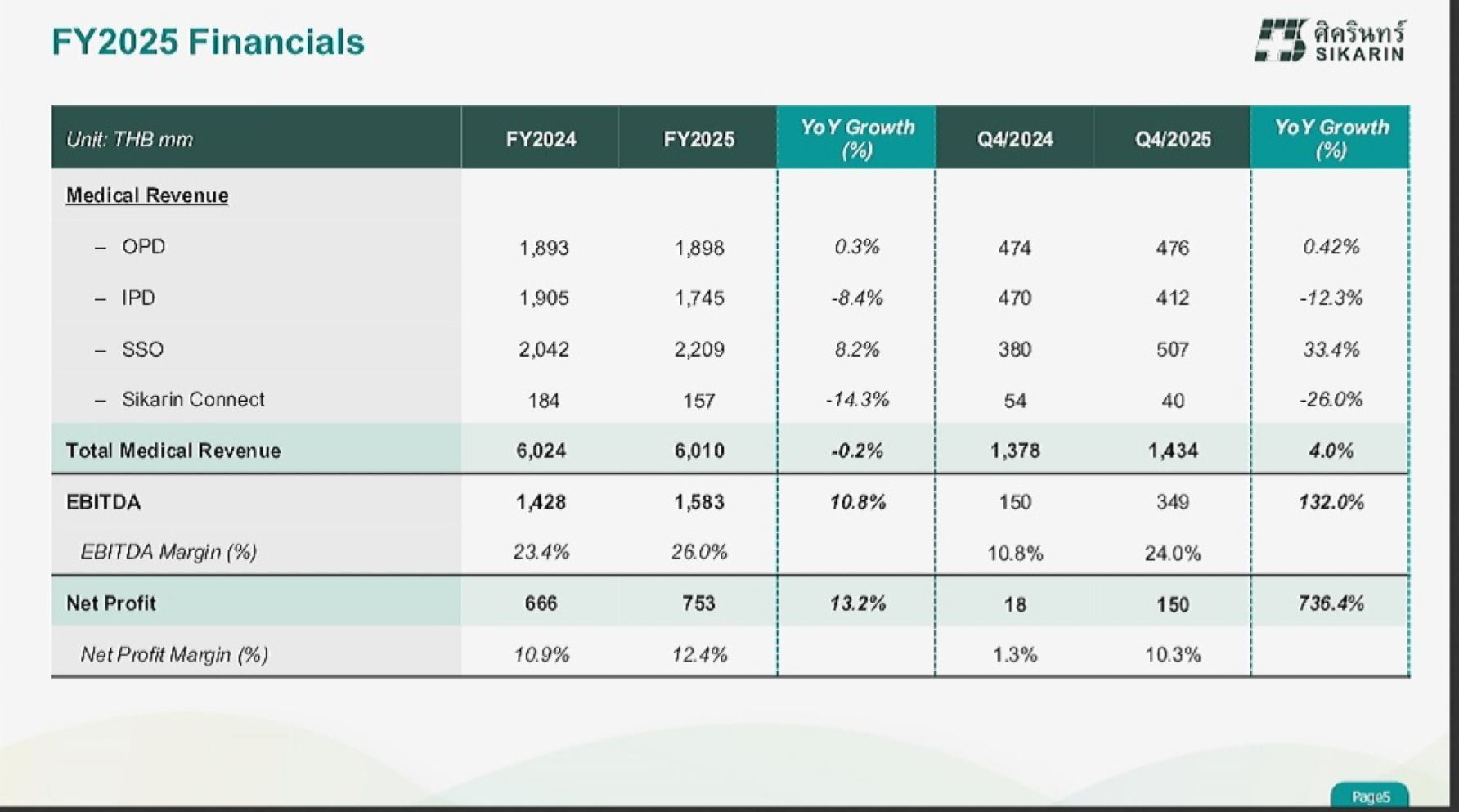 สำหรับผลดำเนินงานปี 2568 บริษัทฯ มีกำไรสุทธิ 751.78 ล้านบาท เพิ่มขึ้น 13.3% จากปีก่อนหน้า ได้แรงหนุนจากรายได้กลุ่มลูกค้าประกันสังคม ที่เพิ่มขึ้น 8.2% เป็น 2,209 ล้านบาท (โดดเด่นในไตรมาสสุดท้าย เมื่อเติบโต 33.4% เป็น 507 ล้านบาท ตามจำนวนผู้ประกันตนที่เพิ่มขึ้นราว 9,500 คน มาอยู่ที่ 374,592 คน) รวมถึงรายได้เฉลี่ยต่อหัวของกลุ่มผู้ป่วยใน (IPD) และกลุ่มผู้ป่วยนอก (OPD) ที่สูงขึ้น โดยรายได้เฉลี่ยต่อหัวต่อครั้งกลุ่ม IPD เพิ่มจากครั้งละ 55,000 บาท เป็น 58,000-59,000 บาท ส่วนรายได้เฉลี่ยกลุ่ม OPD เพิ่มขึ้นเป็นครั้งละ 2,500 บาท ช่วยชดเชยจำนวนผู้ป่วยที่มาใช้บริการลดลง และรายได้จาก Sikarin Connect ที่ลดลง 14.3% ส่งผลให้รายได้รวมประคองตัวใกล้เคียงปีก่อนหน้า ที่ 6,087.97 ล้านบาท ขณะเดียวกัน การควบคุมต้นทุนในการรักษาพยาบาล และค่าใช้จ่ายในการขายและบริหารได้อย่างมีประสิทธิภาพต่อเนื่อง ยังช่วยให้อัตรากำไรขั้นต้นดีดตัวจาก 10.9% ในปี 2567 ขึ้นมาเป็น 12.3% สนับสนุนให้บริษัทฯ พร้อมจ่ายปันผลตอบแทนผู้ถือหุ้น ในอัตราหุ้นละ 0.16 บาท กำหนดวันที่ไม่ได้รับสิทธิปันผล (วันขึ้น XD) 29 เมษายน และกำหนดจ่ายเงินวันที่ 15 พฤษภาคม ซึ่งหากคิดรวมเงินปันผลระหว่างกาลที่จ่ายก่อนหน้านี้ ทำให้บริษัทฯ จ่ายปันผลทั้งปีในอัตราหุ้นละ 0.25 บาท คิดเป็นอัตราปันผลรวม 3.5% อิงราคาหุ้นที่ 7 บาท